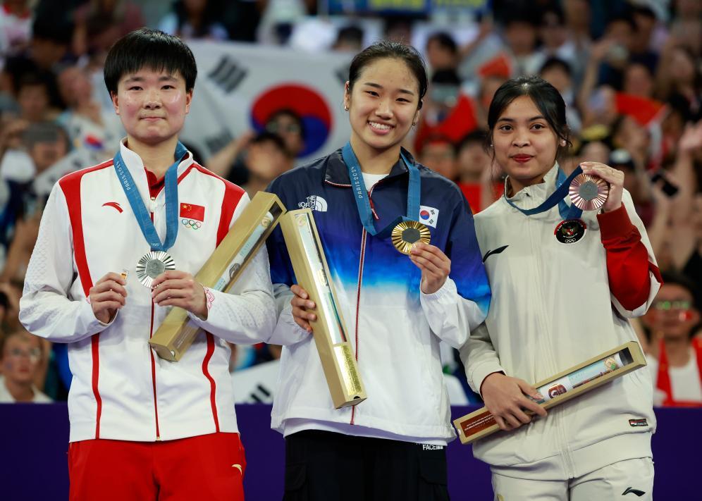 8月5日,羽毛球女單冠軍韓國選手安洗瑩(中)、亞軍中國選手何冰嬌(左)、季軍印度尼西亞選手瑪麗斯卡在頒獎儀式上。