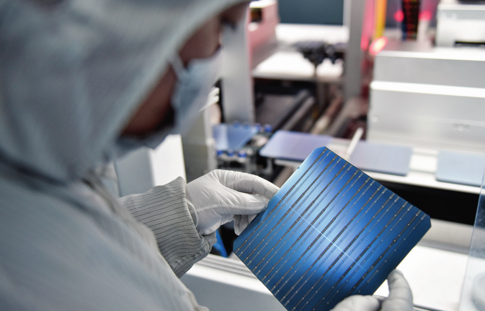 青海黃河上游水電開發(fā)有限責任公司西寧太陽能電力分公司車間,一名工作人員在檢查光伏組件(2023年2月22日攝) 吳剛攝/《瞭望》