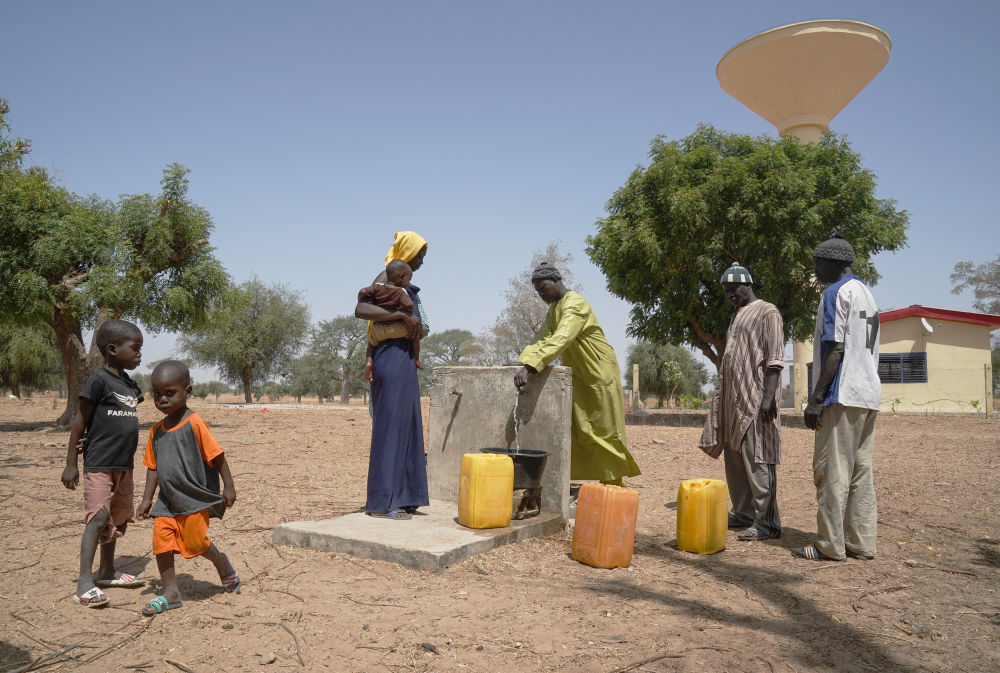 2023年3月20日,在塞內加爾久爾貝勒區(qū)的泰內富勒村,水井協(xié)調員馬馬杜·迪恩(右三)幫助村民取水。新華社記者 韓旭 攝