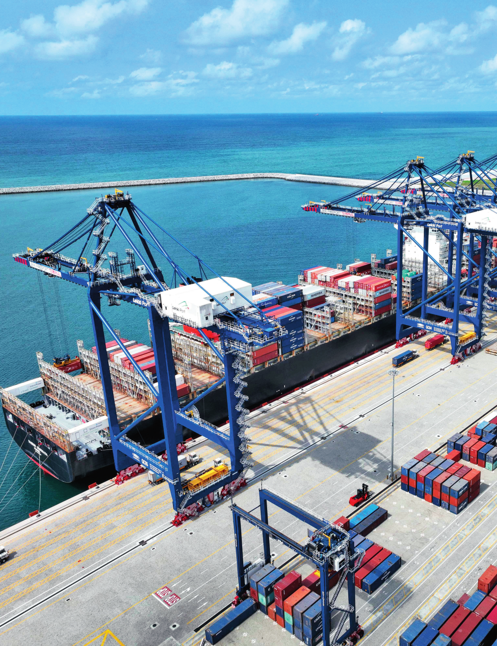 由中國港灣工程有限責(zé)任公司承建的尼日利亞萊基深水港位于中尼合作建設(shè)的拉各斯萊基自貿(mào)區(qū)內(nèi),是尼日利亞首個現(xiàn)代化深水港和最大港口。圖為一艘貨輪在尼日利亞拉各斯萊基深水港裝卸集裝箱(2024 年 3 月 11 日攝)萊基港公司供圖
