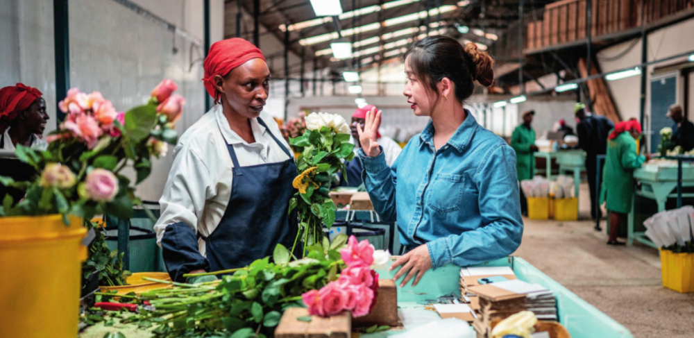 湖南璽悅國際貿(mào)易有限公司負(fù)責(zé)人黃梓楠(右)在肯尼亞納紐基的坦布濟花卉農(nóng)場挑選鮮花(2024年5月18日攝)王冠森攝 / 本刊