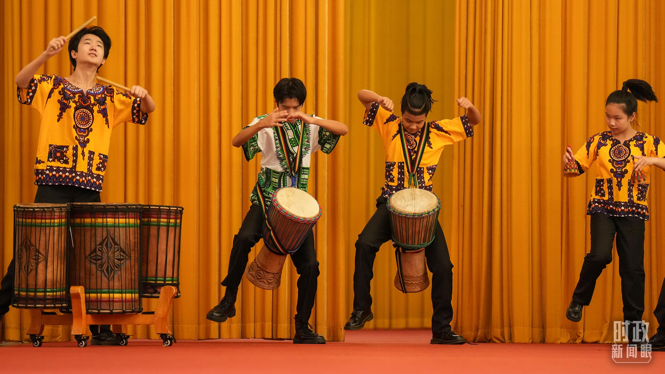在前往宴會(huì)廳沿途,身著中國民族服裝和非洲特色服裝的青少年,打起歡快的非洲鼓,載歌載舞歡迎遠(yuǎn)道而來的貴賓。