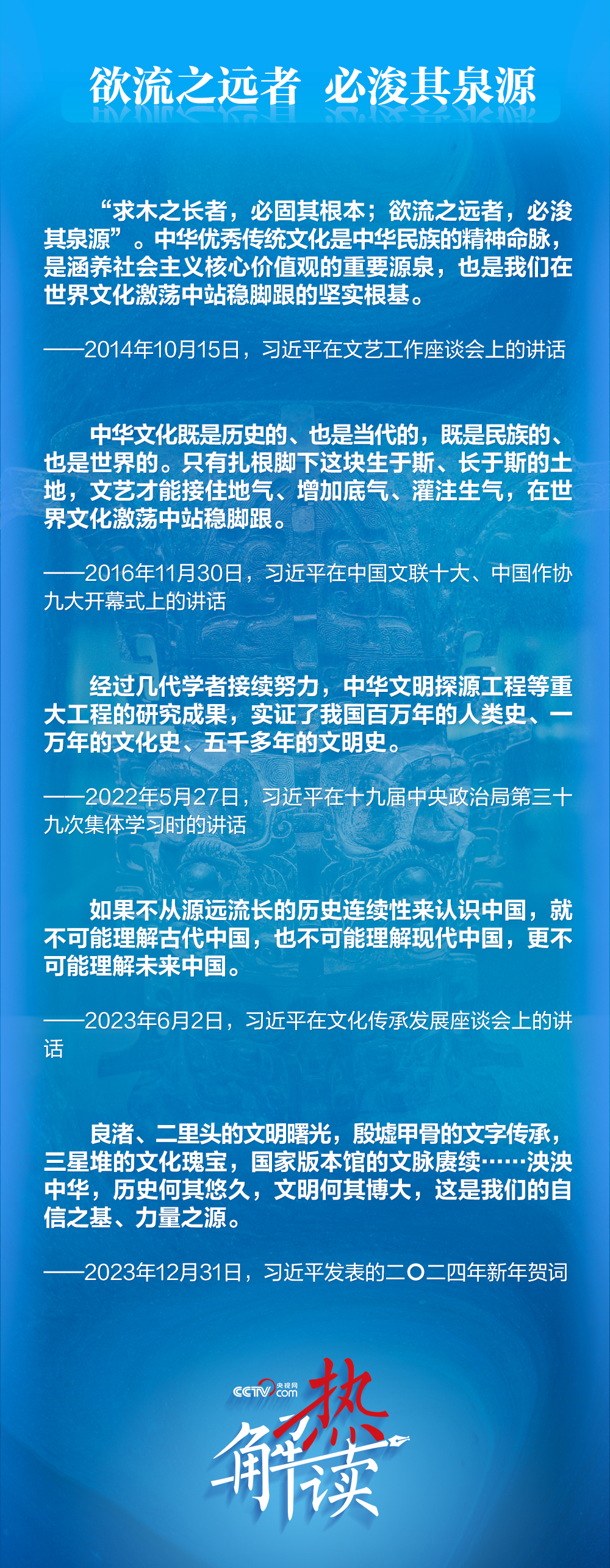 一件件文物、一處處文化古跡、一項(xiàng)項(xiàng)文化藝術(shù),串連起中華民族的文化史,蘊(yùn)藏著“何以中國(guó)”的文化力量。總書記對(duì)中華文明之源的關(guān)注,彰顯的正是他對(duì)推動(dòng)文化繁榮、建設(shè)文化強(qiáng)國(guó)的深刻思考和文化自信。