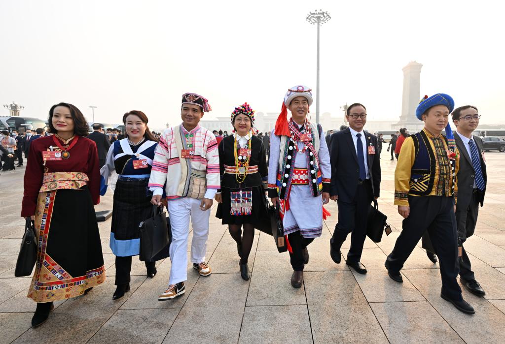 2023年3月5日,第十四屆全國人民代表大會第一次會議在北京人民大會堂開幕。這是全國人大代表走向會場。 新華社記者 陳益宸 攝