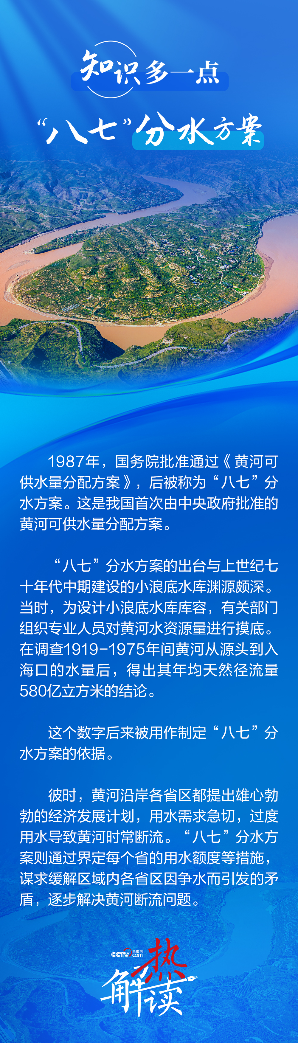 “八七”分水方案是上世紀八十年代我國批準的黃河可供水量分配方案。該方案以1980年實際用水量為基準,綜合考慮了沿黃各省區(qū)的灌溉發(fā)展規(guī)模、工業(yè)和城市用水增長以及大中型水利工程興建等因素,來為沿黃各省區(qū)分配黃河用水權?!鞍似摺狈炙桨缸?987年國務院批復后沿用至今,未重新調整。