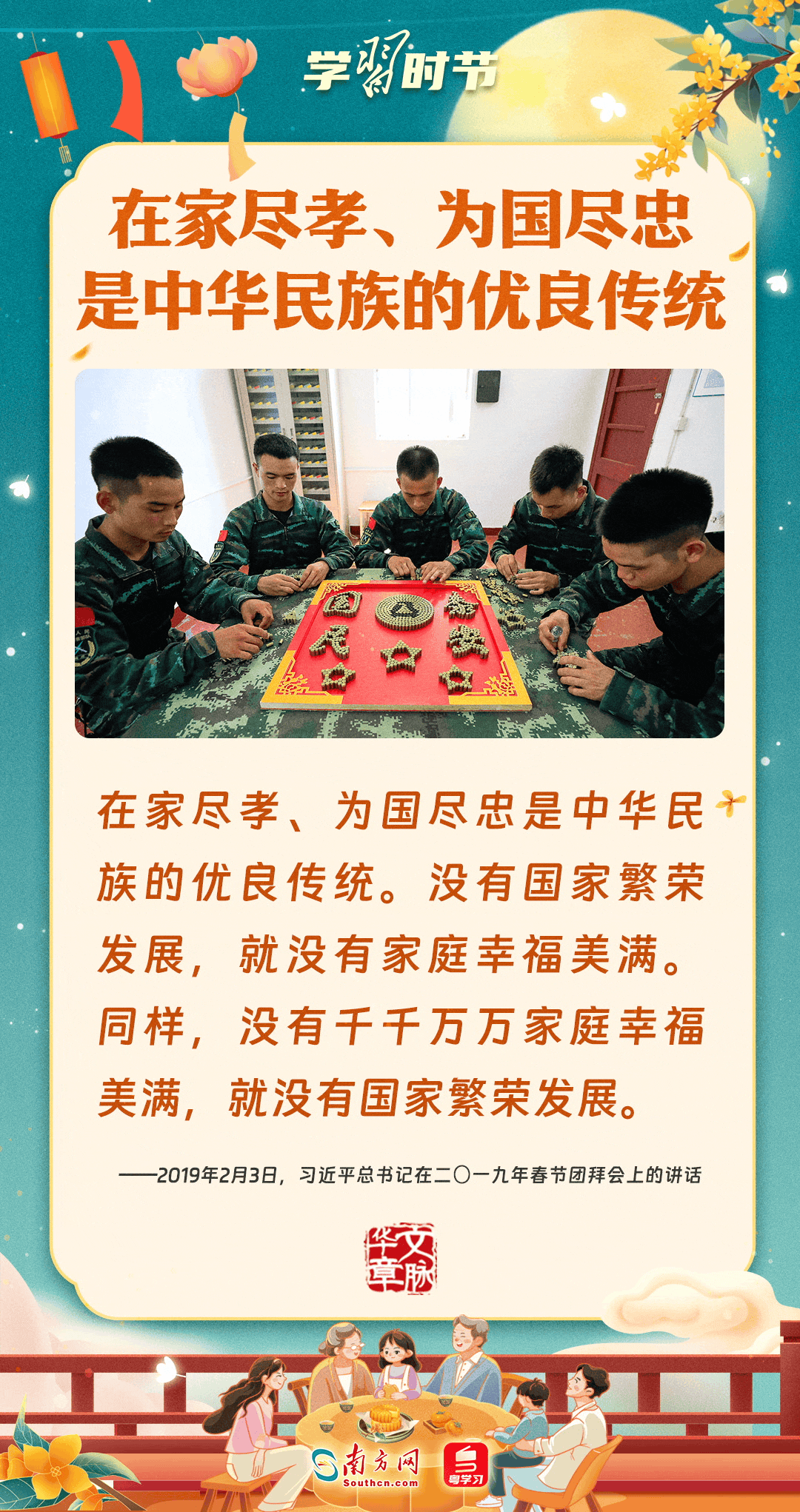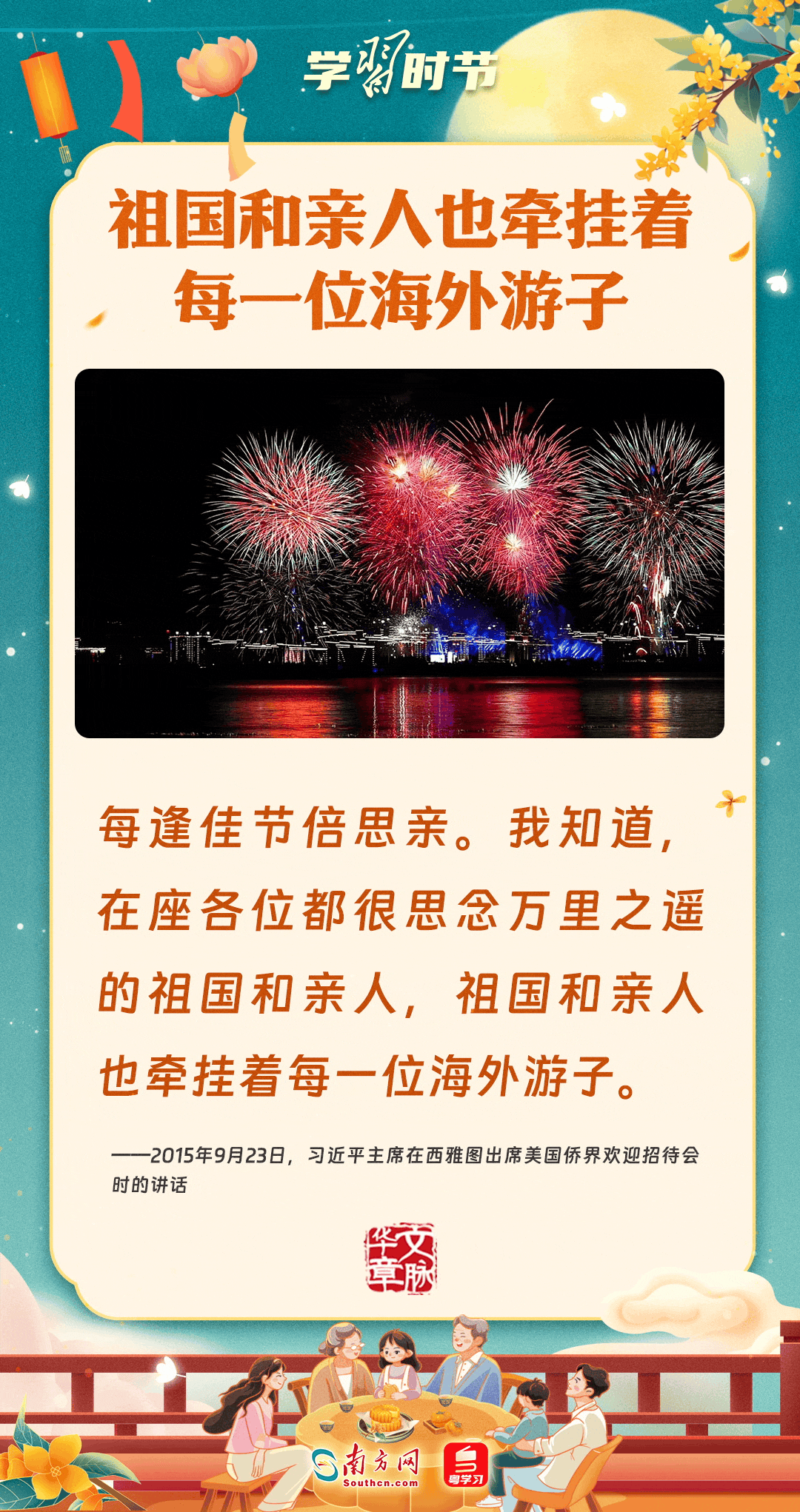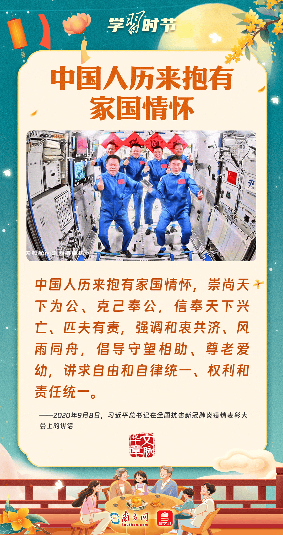 明月寄相思,家國總關(guān)情。作為中華優(yōu)秀傳統(tǒng)文化的重要載體之一,中秋節(jié)不但寄托著海內(nèi)外華人對闔家團(tuán)圓的美好期許,還承載著深厚的故鄉(xiāng)情、家國情。習(xí)近平總書記曾在多個(gè)場合深刻闡述個(gè)人、家庭與國家之間的關(guān)系,強(qiáng)調(diào)要厚植家國情懷,把實(shí)現(xiàn)個(gè)人夢、家庭夢融入國家夢、民族夢之中。中秋佳節(jié),讓我們一起回顧總書記那些經(jīng)典話語,共同感受他至深至厚的家國情懷。