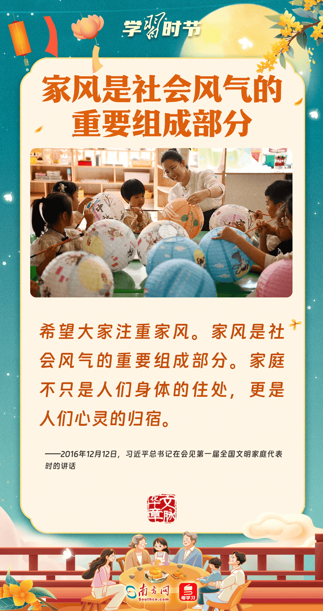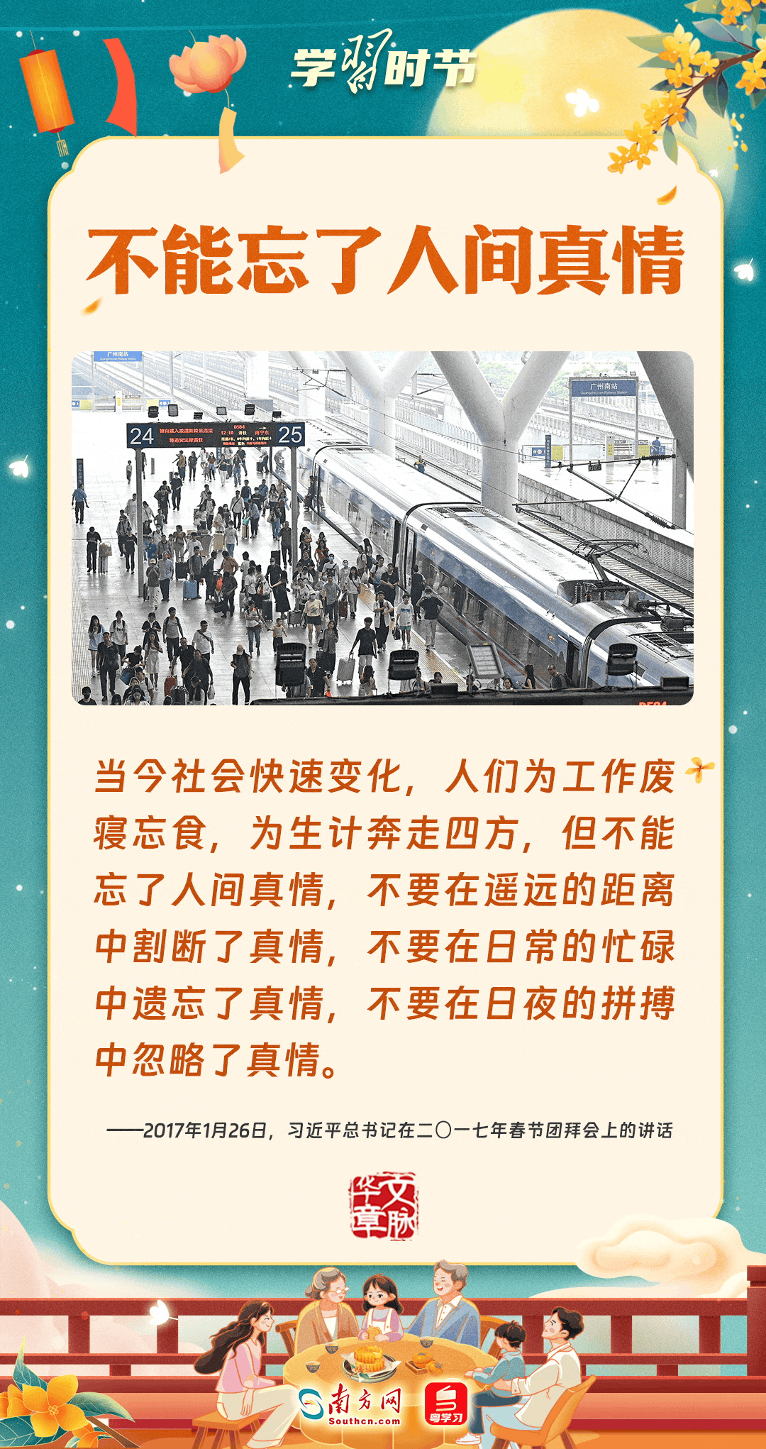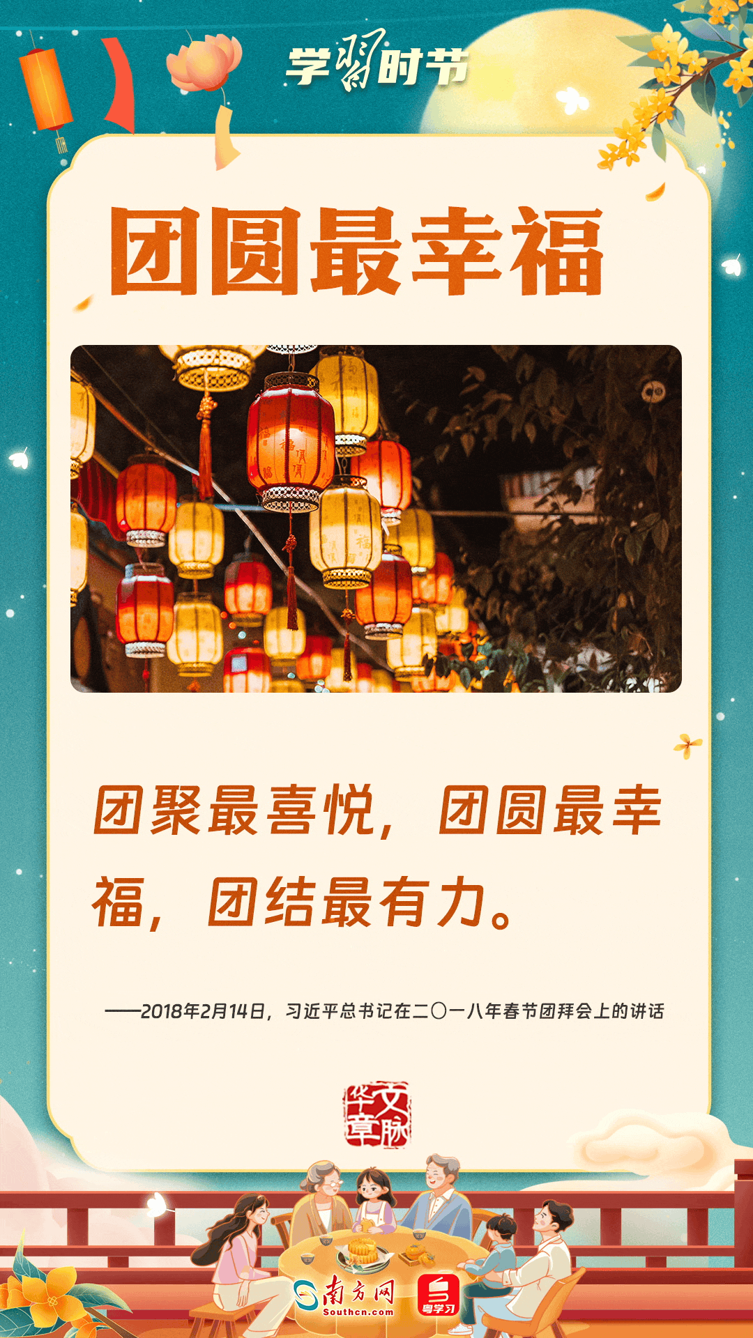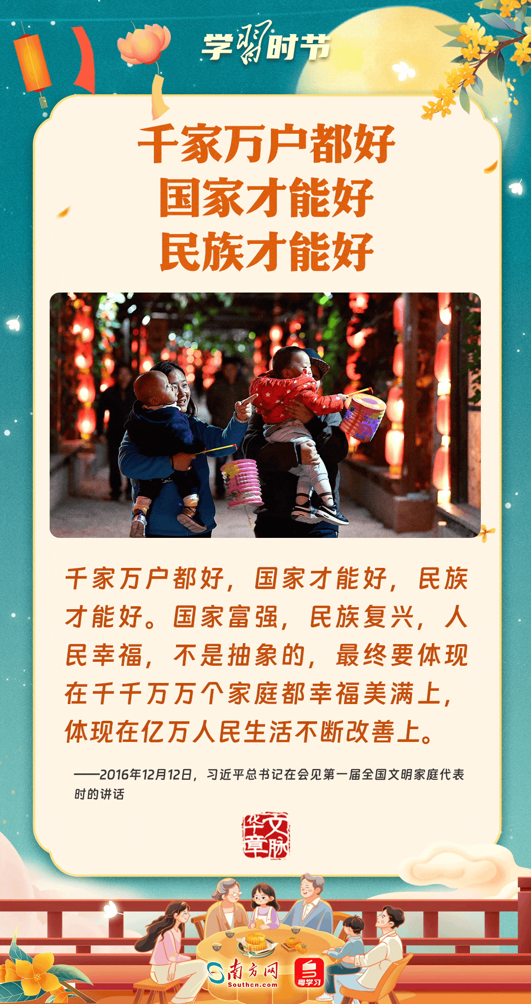 明月寄相思,家國總關(guān)情。作為中華優(yōu)秀傳統(tǒng)文化的重要載體之一,中秋節(jié)不但寄托著海內(nèi)外華人對闔家團(tuán)圓的美好期許,還承載著深厚的故鄉(xiāng)情、家國情。習(xí)近平總書記曾在多個(gè)場合深刻闡述個(gè)人、家庭與國家之間的關(guān)系,強(qiáng)調(diào)要厚植家國情懷,把實(shí)現(xiàn)個(gè)人夢、家庭夢融入國家夢、民族夢之中。中秋佳節(jié),讓我們一起回顧總書記那些經(jīng)典話語,共同感受他至深至厚的家國情懷。