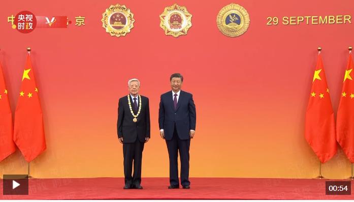中華人民共和國國家勛章和國家榮譽(yù)稱號頒授儀式9月29日上午10時在人民大會堂隆重舉行。中共中央總書記、國家主席、中央軍委主席習(xí)近平向“人民科學(xué)家”國家榮譽(yù)稱號獲得者趙忠賢頒授獎?wù)隆?/p>