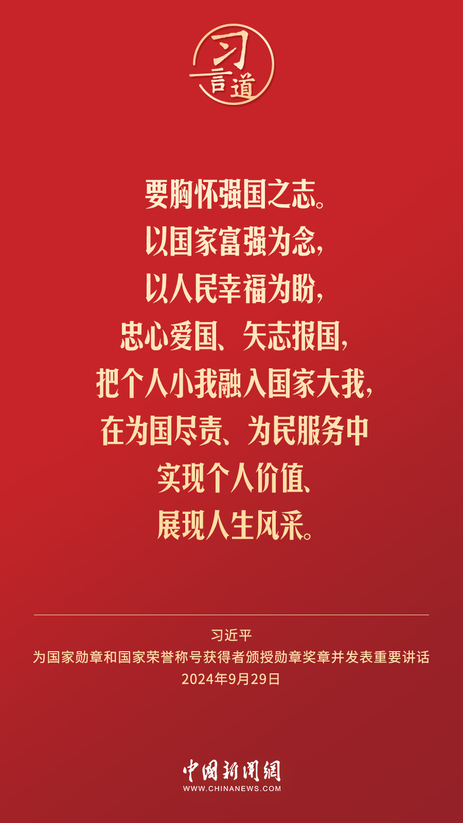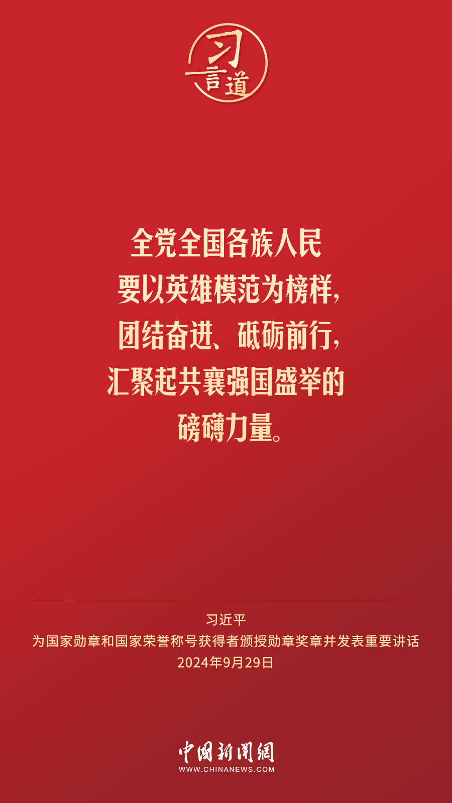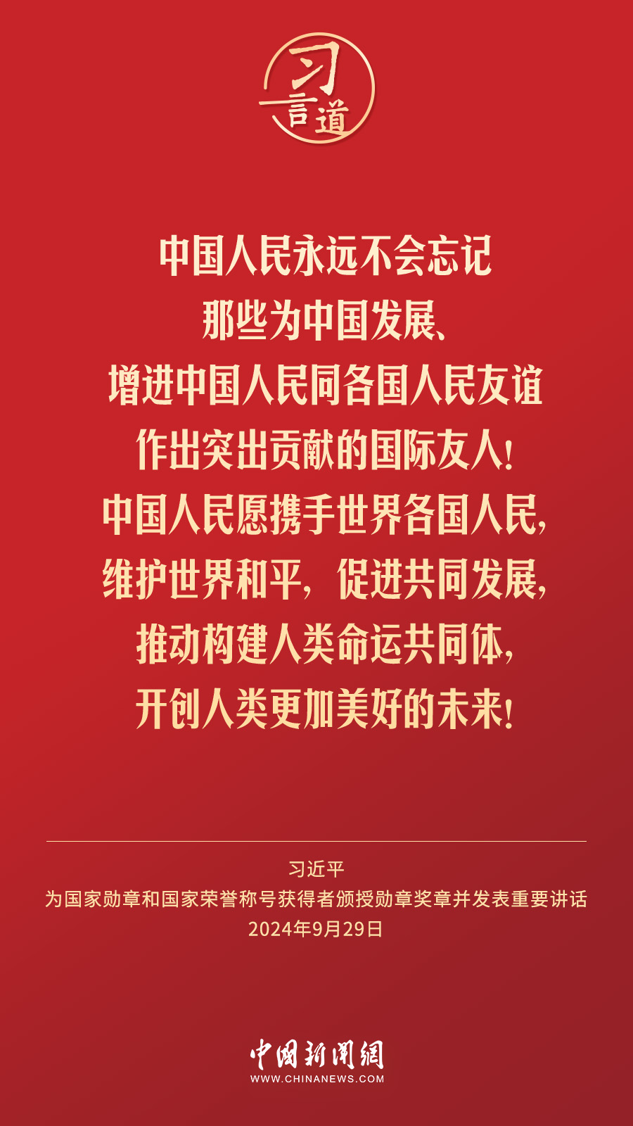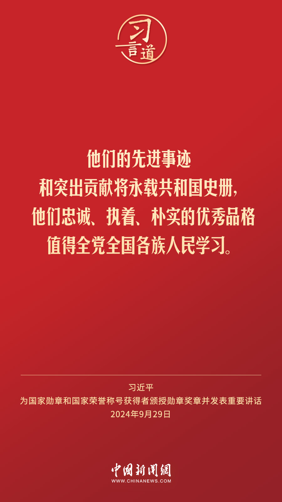 經(jīng)中共中央批準(zhǔn),中華人民共和國(guó)國(guó)家勛章和國(guó)家榮譽(yù)稱(chēng)號(hào)頒授儀式于9月29日上午10時(shí)在人民大會(huì)堂隆重舉行。中共中央總書(shū)記、國(guó)家主席、中央軍委主席習(xí)近平向國(guó)家勛章和國(guó)家榮譽(yù)稱(chēng)號(hào)獲得者分別授予“共和國(guó)勛章”“友誼勛章”和國(guó)家榮譽(yù)稱(chēng)號(hào)獎(jiǎng)?wù)虏l(fā)表重要講話(huà)。習(xí)近平指出——