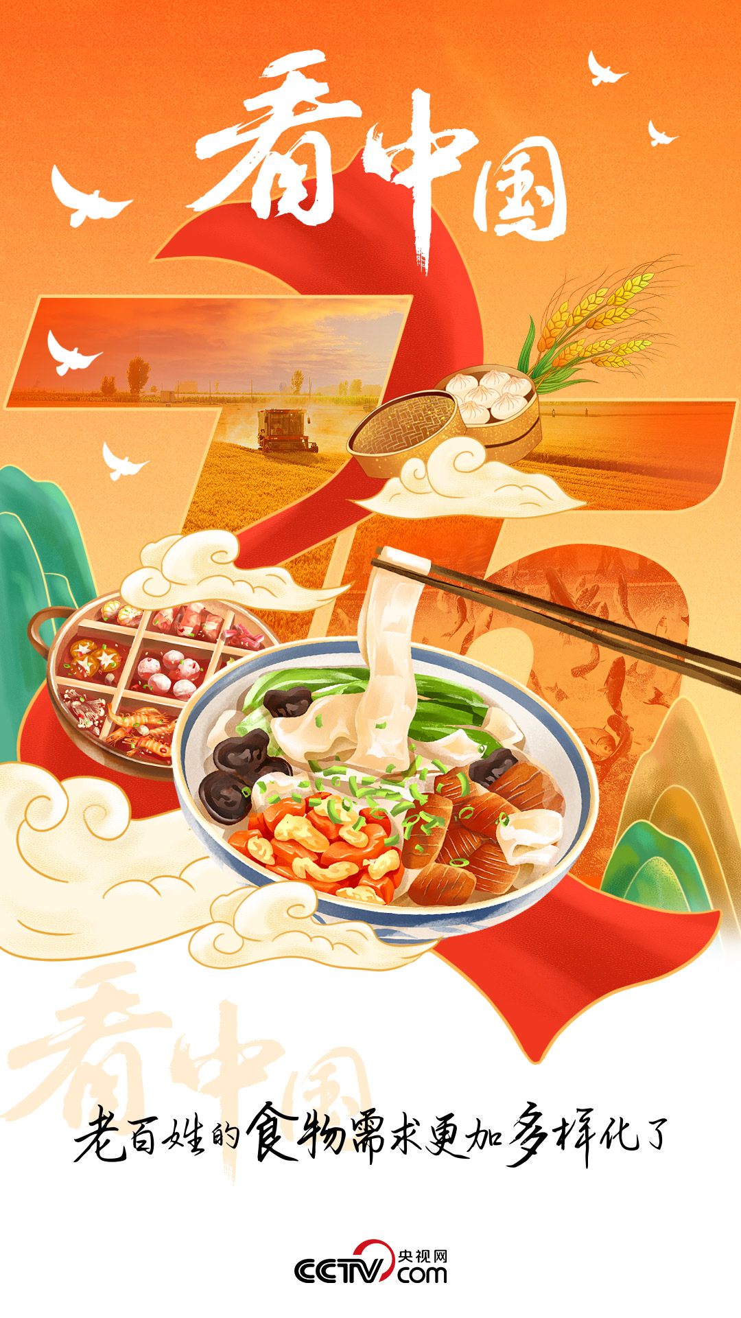 2023年,城鎮(zhèn)居民人均糧食消費量115.6公斤,比1956年下降33.4%,人均豬肉、牛羊肉和蛋類消費量分別比1956年增長3.9倍、2.6倍和3.3倍。2023年,農(nóng)村居民人均糧食消費量159.8公斤,比1956年下降35.2%,人均豬肉、牛羊肉和蛋類消費量分別比1956年增長9.6倍、2.4倍和21.6倍……百姓餐桌上米面糧食不再是“主角”,肉蛋奶、果菜魚、菌菇筍等原本的副食“閃亮登場”。