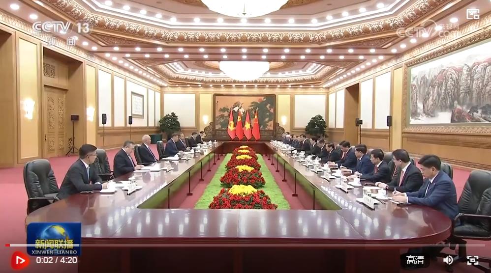 習(xí)近平指出,堅持共產(chǎn)黨領(lǐng)導(dǎo)和社會主義制度是中越兩國最本質(zhì)的特征,也是發(fā)展中越關(guān)系最堅實的政治基礎(chǔ)。中方將越南視為周邊外交的優(yōu)先方向,愿同越方一道,在深化高水平互利合作上走在前列,在維護國際公平正義上走在前列,在推動人類進步事業(yè)上走在前列,攜手構(gòu)建具有戰(zhàn)略意義的中越命運共同體。