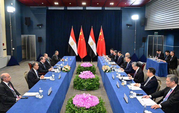 習(xí)近平祝賀并歡迎埃及首次作為正式成員參加金磚國家領(lǐng)導(dǎo)人會晤。習(xí)近平指出,今年是“中?;锇槟辍焙蛢蓢⑷鎽?zhàn)略伙伴關(guān)系10周年。中方堅定支持埃及維護國家主權(quán)、安全、發(fā)展利益,愿同埃方做守望相助的真誠朋友、攜手發(fā)展的親密伙伴。雙方要繼續(xù)堅定相互支持,鞏固政治互信,深化務(wù)實合作,高質(zhì)量共建“一帶一路”,密切人文交流,推動雙邊關(guān)系朝著構(gòu)建面向新時代的中埃命運共同體目標(biāo)持續(xù)邁進。中方也愿同埃方加強協(xié)調(diào),推動“大金磚合作”行穩(wěn)致遠(yuǎn),進一步提升全球南方影響力和發(fā)言權(quán),維護發(fā)展中國家共同利益。