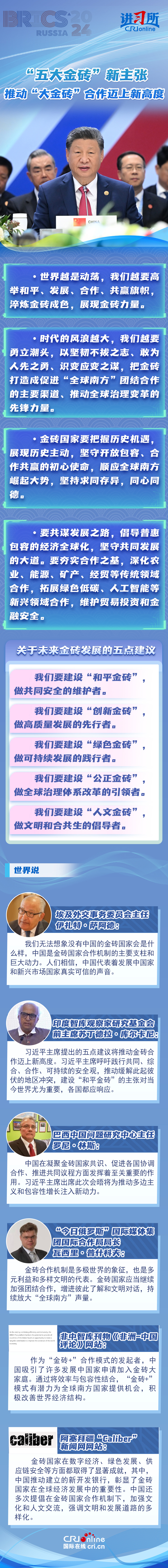 “時(shí)代的風(fēng)浪越大,我們?cè)揭铝⒊鳖^,以堅(jiān)韌不拔之志、敢為人先之勇、識(shí)變應(yīng)變之謀,把金磚打造成促進(jìn)‘全球南方’團(tuán)結(jié)合作的主要渠道、推動(dòng)全球治理變革的先鋒力量?!碑?dāng)?shù)貢r(shí)間10月23日,習(xí)近平主席在俄羅斯喀山出席金磚國家領(lǐng)導(dǎo)人第十六次會(huì)晤并發(fā)表重要講話,提出共建“和平金磚”“創(chuàng)新金磚”“綠色金磚”“公正金磚”“人文金磚”,為“大金磚合作”擘畫藍(lán)圖。