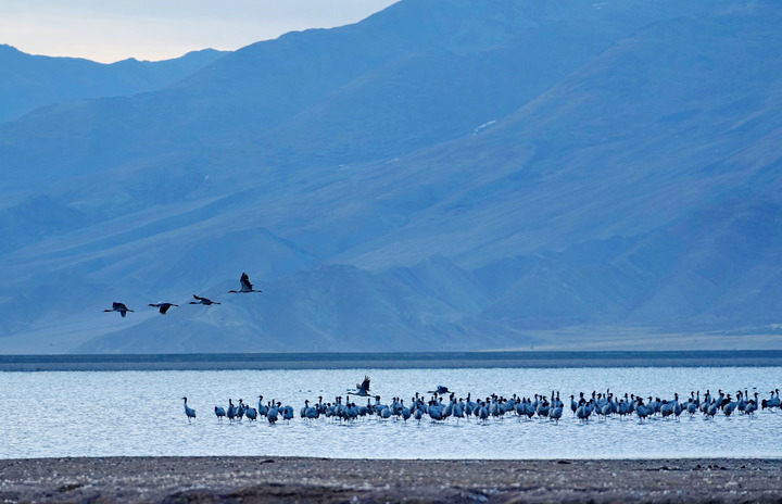 在雅魯藏布江中游河谷黑頸鶴國家級自然保護區(qū),黑頸鶴飛翔在一片水域上空(2024年3月17日攝)。多年來,西藏各級黨委政府和對口援藏省市接續(xù)投入2.4億余元資金開展生態(tài)建設,創(chuàng)設的雅江北岸南木林生態(tài)示范區(qū)已完成造林4萬多畝,昔日戈壁荒灘漸變江畔綠洲,也成了黑頸鶴越冬的理想棲息地。監(jiān)測數(shù)據(jù)顯示,西藏境內(nèi)的黑頸鶴種群數(shù)量持續(xù)增長,已由上世紀的不足3000只增長到目前的1萬余只。