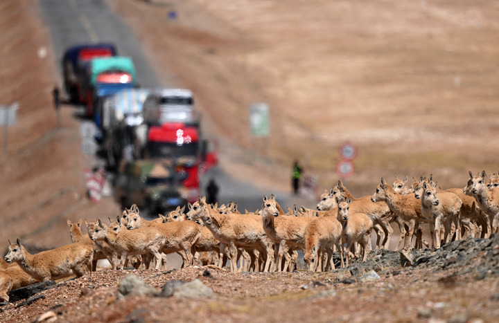 2023年5月29日,當?shù)毓芾聿块T工作人員在青藏公路上臨時截停來往車輛,為一群前往可可西里卓乃湖產(chǎn)仔的藏羚羊讓路??煽晌骼锏靥幦磭夜珗@,是國家一級保護動物藏羚羊重要的棲息地。每年5月至7月,來自青海三江源、新疆阿爾金山、西藏羌塘的雌性藏羚羊會遷徙到可可西里卓乃湖,待產(chǎn)仔后再攜幼仔返回原棲息地。
