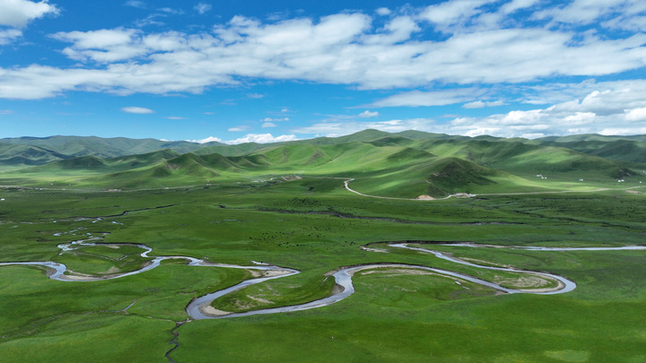 這是2023年7月6日拍攝的甘肅省甘南藏族自治州瑪曲縣阿萬倉濕地景色(無人機照片)?,斍h是黃河上游重要的水源涵養(yǎng)區(qū)和生態(tài)功能區(qū),被稱為“黃河之腎”。多年來,甘肅省實施退牧還草、退化草原生態(tài)修復等治理工程,草原生態(tài)環(huán)境明顯改善。