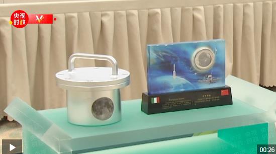 工藝擺件以嫦娥五號探月為設計元素,月球部分裝有月壤。科研樣品為月壤鏟取樣和鉆取樣,展現(xiàn)了中意航天領域合作高水平。
