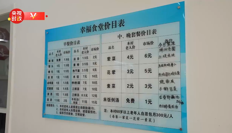 隨行記者用鏡頭記錄了這樣一幕:站在養(yǎng)老服務(wù)驛站幸福食堂價目表前,總書記仔細(xì)察看當(dāng)天菜單。菜單中既有種類豐富的早餐,也有六菜兩湯的中、晚套餐,葷素搭配、營養(yǎng)均衡;村中老人用餐還有特別優(yōu)惠,另外還有免費的稀飯和米飯例湯……