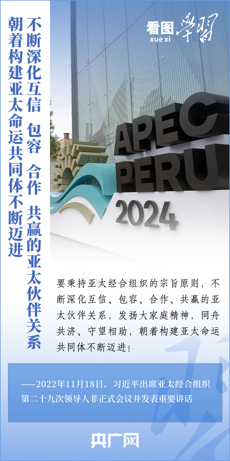 亞太經合組織(APEC)是亞太地區(qū)層級最高、領域最廣、最具影響力的經濟合作機制。11月13日至17日,習近平主席赴利馬出席亞太經合組織第三十一次領導人非正式會議并對秘魯進行國事訪問。從“亞太夢想”到“APEC方式”,從“亞太伙伴關系”到“亞太命運共同體”……2013年以來,習近平主席出席或主持歷次APEC領導人非正式會議,就全球及地區(qū)形勢、亞太區(qū)域合作、APEC未來發(fā)展等一系列重大問題闡釋中國主張,推動不斷深化互信、包容、合作、共贏的亞太伙伴關系,建設開放、活力、強韌、和平的亞太共同體。一起來學習!