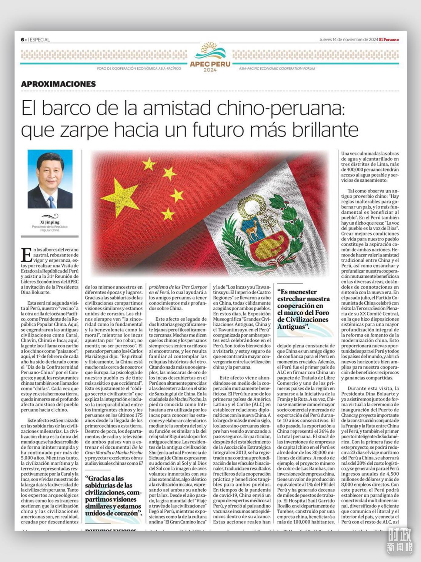 △習(xí)主席在《秘魯人報》發(fā)表題為《讓中秘友好之船揚帆遠(yuǎn)航》的署名文章。(總臺國廣記者吳倩)