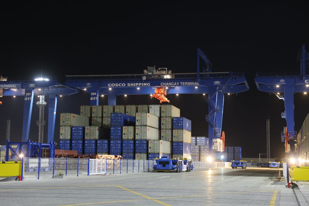 通過(guò)大屏幕連線,兩國(guó)元首共同下達(dá)開港指令。利馬以北80公里的錢凱港,在夜幕中開啟了港口作業(yè)。