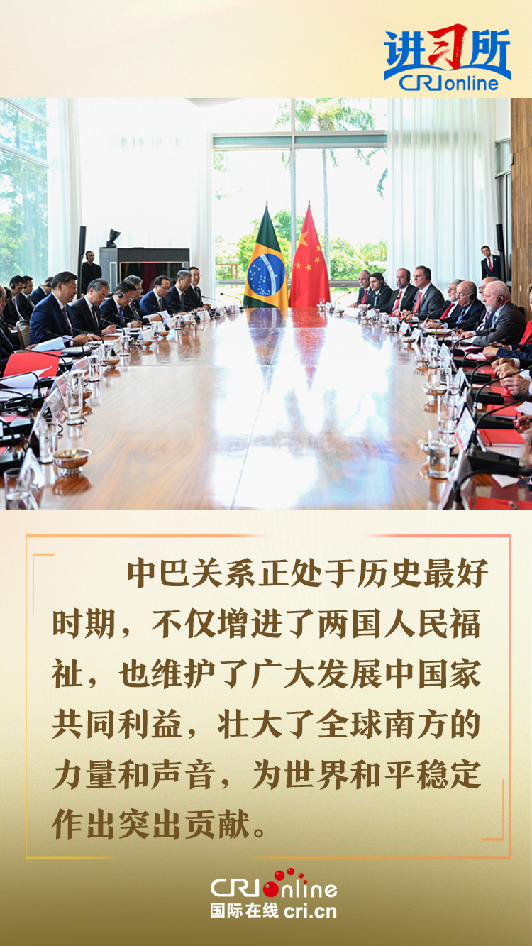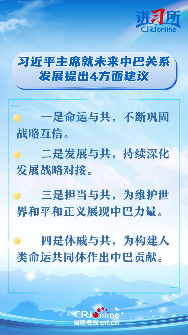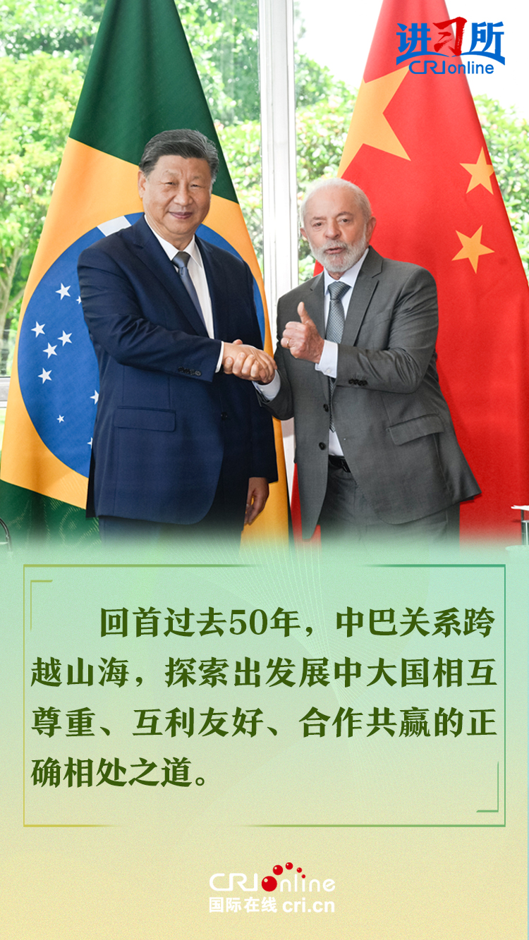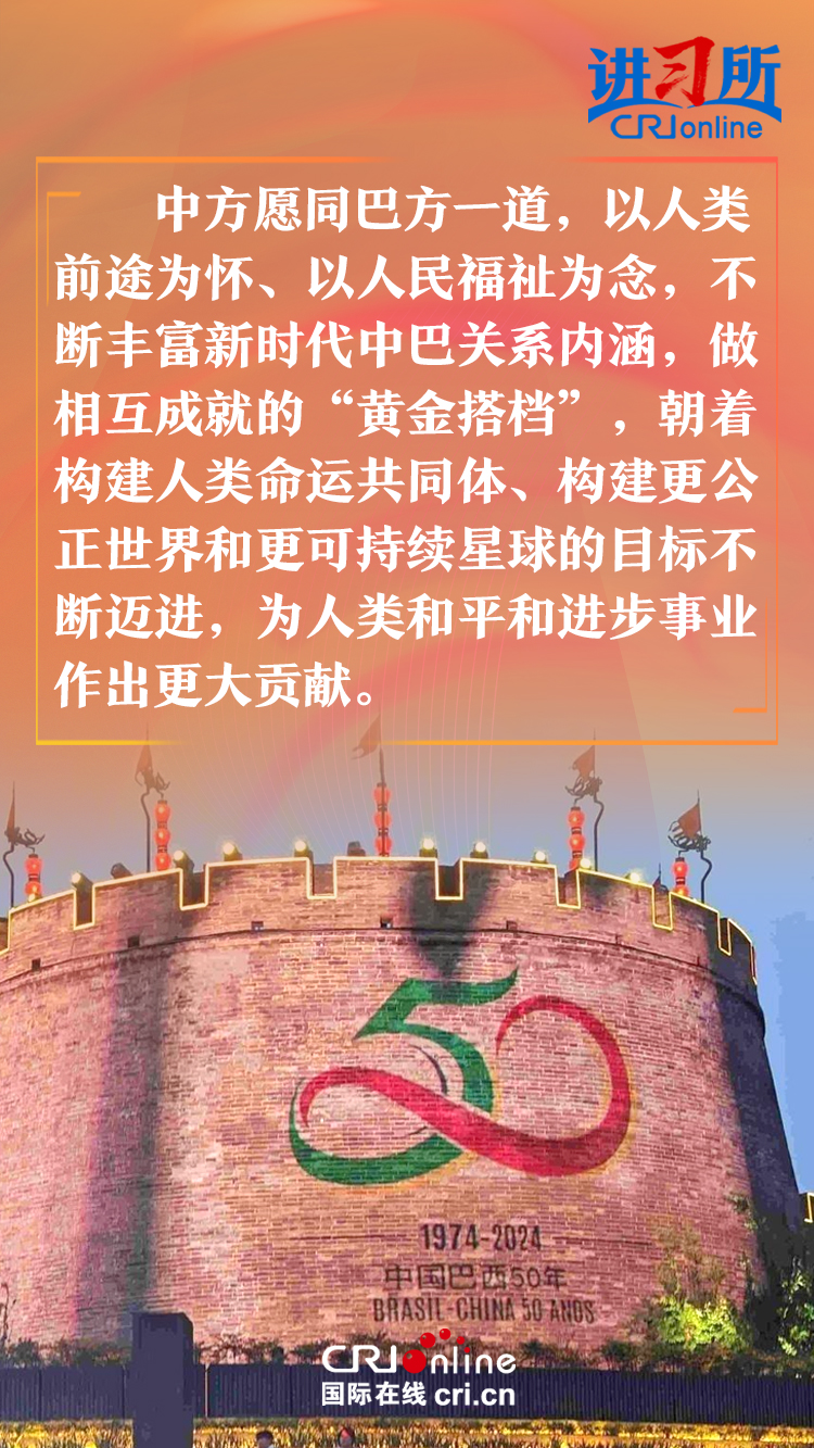 今年是中巴建交50周年。習(xí)近平指出,回首過去50年,中巴關(guān)系跨越山海,探索出發(fā)展中大國相互尊重、互利友好、合作共贏的正確相處之道。中方愿同巴方一道,以人類前途為懷、以人民福祉為念,不斷豐富新時代中巴關(guān)系內(nèi)涵,做相互成就的“黃金搭檔”,朝著構(gòu)建人類命運共同體、構(gòu)建更公正世界和更可持續(xù)星球的目標(biāo)不斷邁進,為人類和平和進步事業(yè)作出更大貢獻。