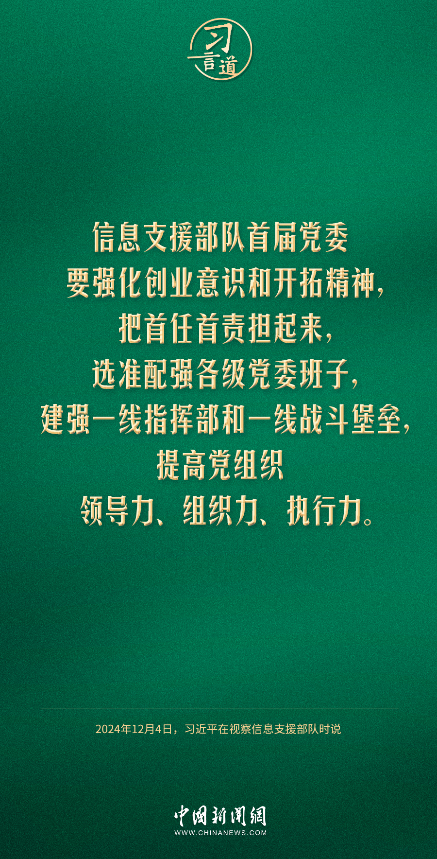 中共中央總書(shū)記、國(guó)家主席、中央軍委主席習(xí)近平4日視察信息支援部隊(duì),代表黨中央和中央軍委,對(duì)信息支援部隊(duì)第一次黨代表大會(huì)的召開(kāi)表示熱烈祝賀,向信息支援部隊(duì)全體官兵致以誠(chéng)摯問(wèn)候。習(xí)近平指出——