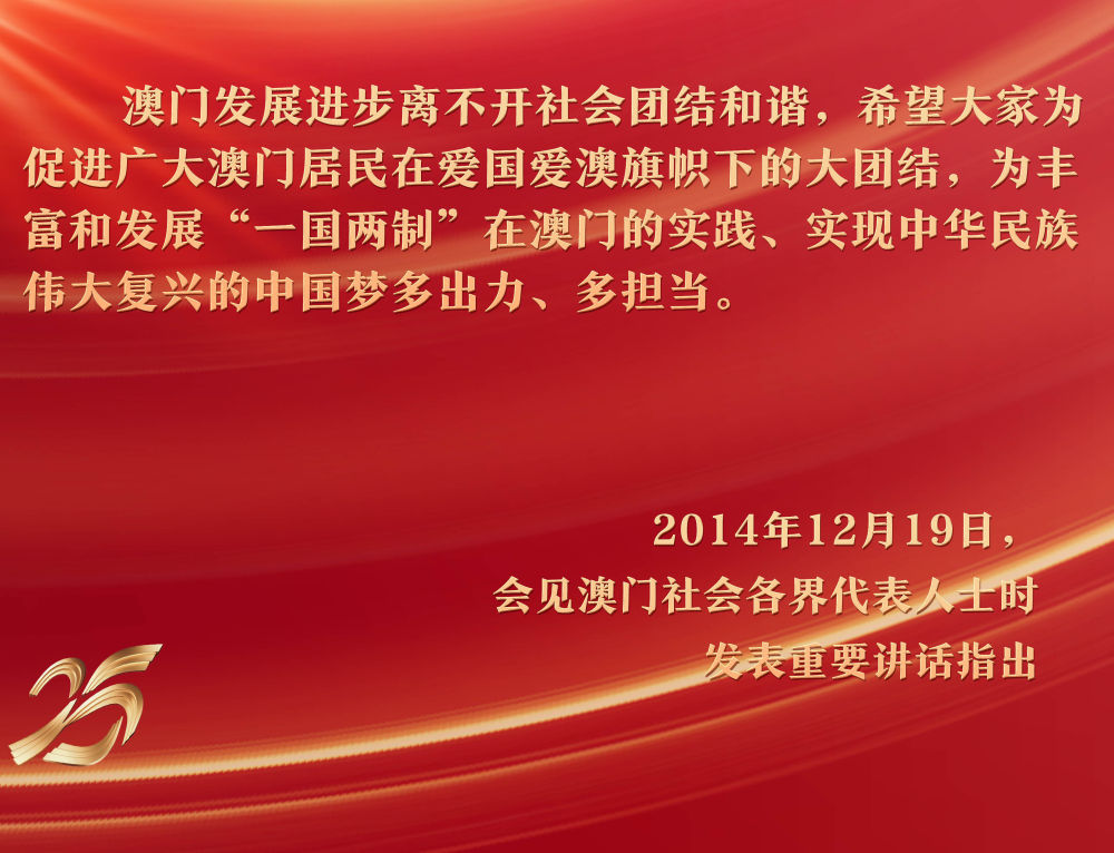25年來,澳門社會(huì)各界在愛國(guó)愛澳的旗幟下實(shí)現(xiàn)廣泛團(tuán)結(jié),愛國(guó)愛澳力量在社會(huì)政治生活中始終占據(jù)主導(dǎo),為特區(qū)政府依法有效施政、確保“一國(guó)兩制”在澳門成功實(shí)踐奠定了堅(jiān)實(shí)的基礎(chǔ)。