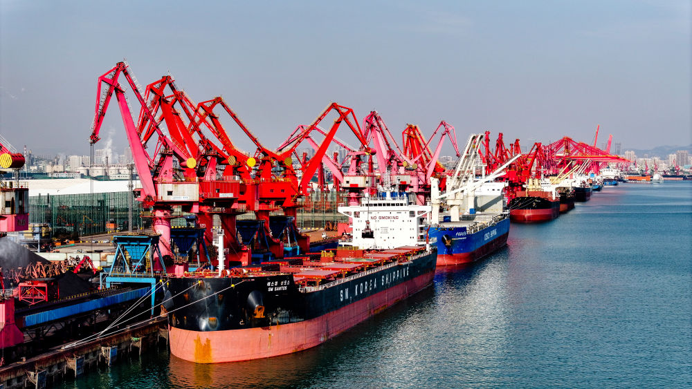 在山東港口日照港煤炭泊位,貨輪停泊卸煤(2024年12月4日攝,無(wú)人機(jī)照片)。新華社記者 郭緒雷 攝