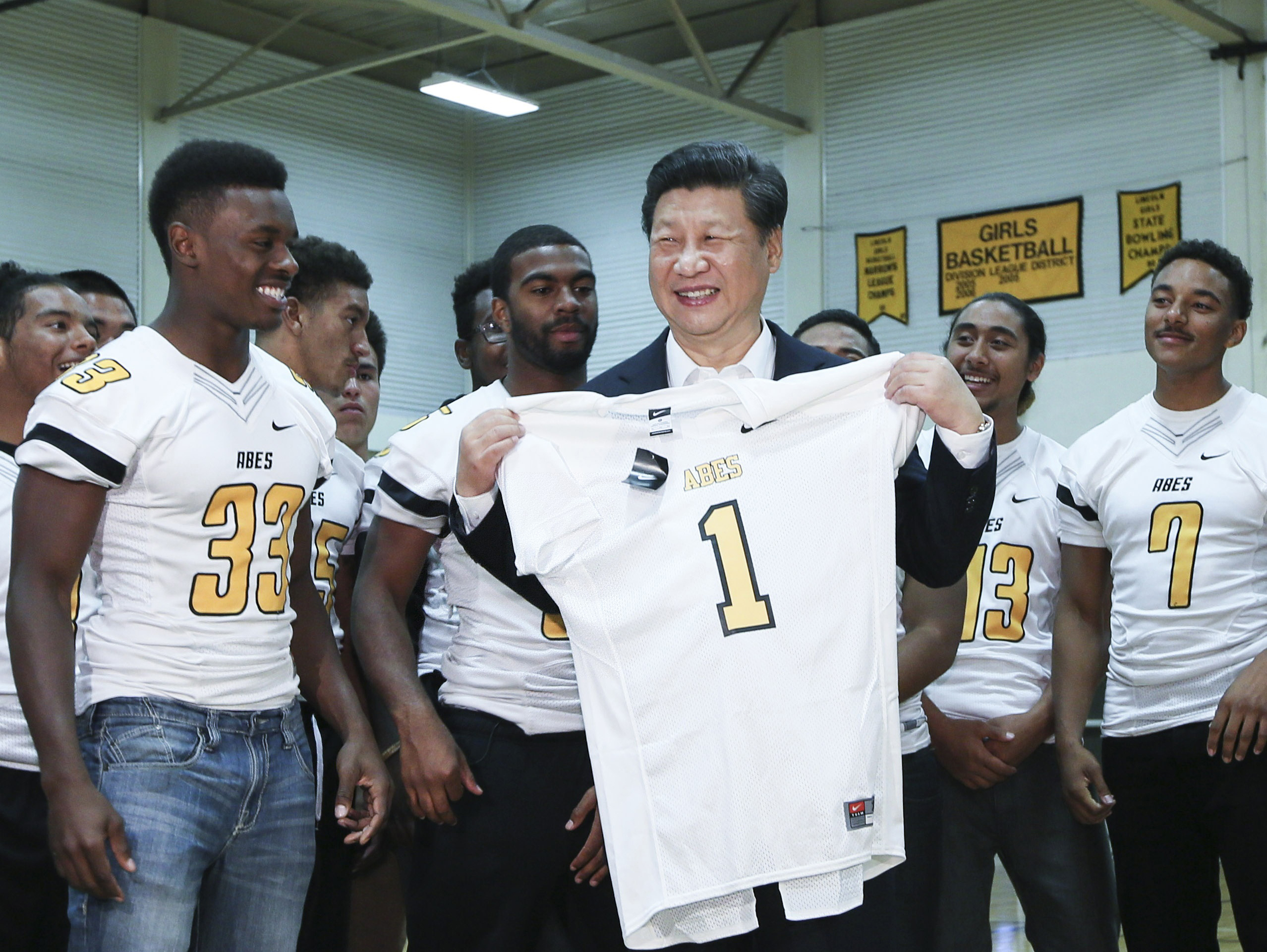 當?shù)貢r間2015年9月23日,習近平主席參觀美國塔科馬市林肯中學。圖為習主席接受學生們贈送橄欖球衣。