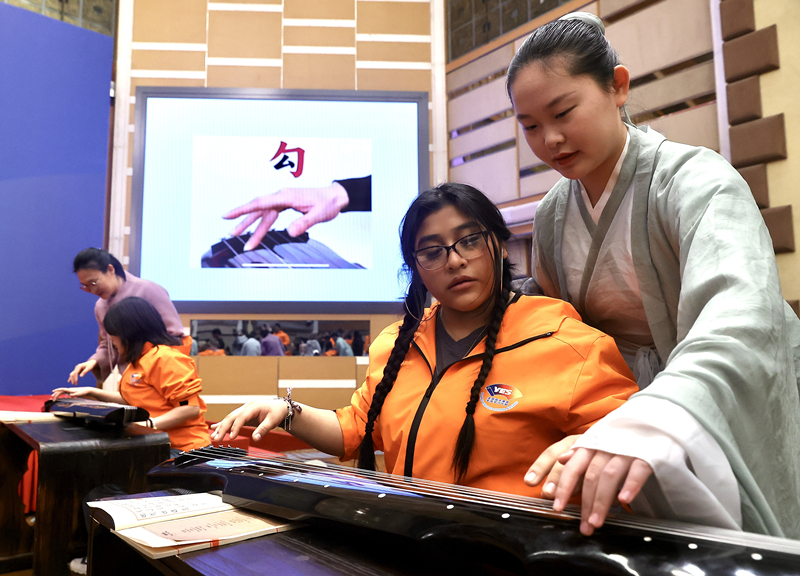2024年3月20日,美國華盛頓州中學生代表團北京大學交流活動在北京大學英杰交流中心舉行。圖為來自華盛頓州的中學生體驗古琴。