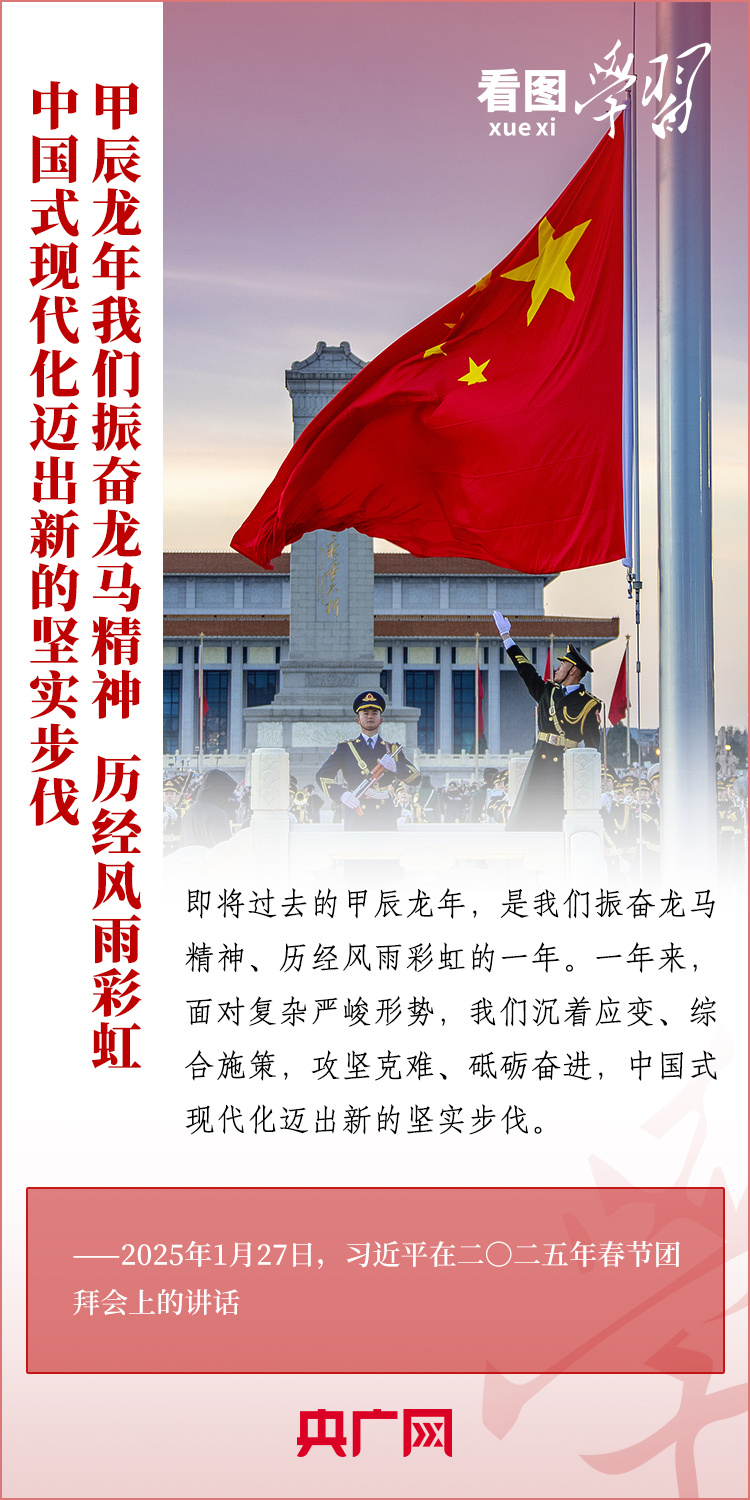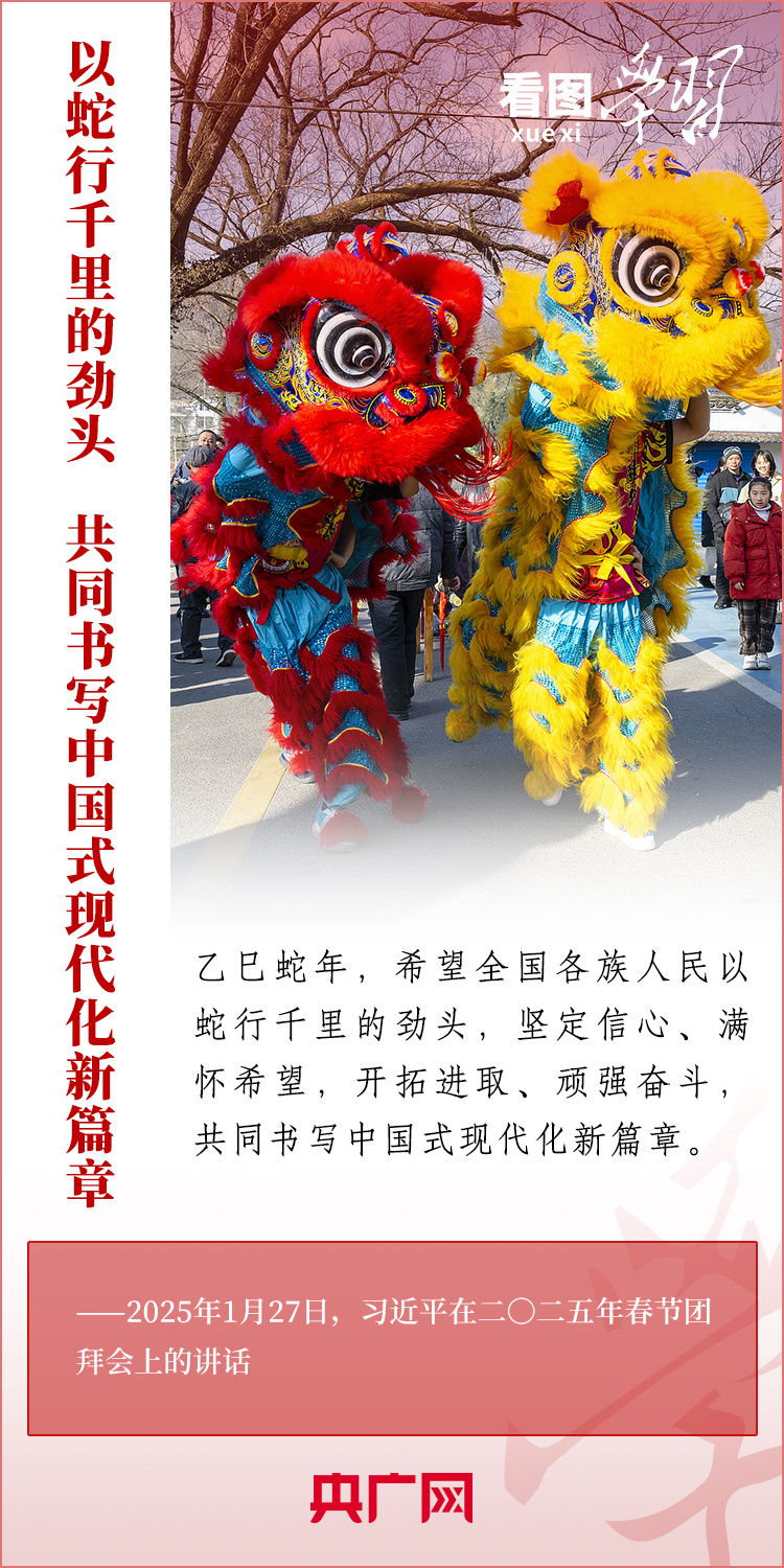 1月27日,中共中央、國務(wù)院在北京舉行春節(jié)團(tuán)拜會,習(xí)近平總書記發(fā)表熱情洋溢的講話,向全國各族人民、港澳臺同胞、海外僑胞拜年并致以新春祝福??倳浽谥v話中深情回顧過去一年中國式現(xiàn)代化取得很不平凡的發(fā)展歷程,“希望全國各族人民以蛇行千里的勁頭,堅定信心、滿懷希望,開拓進(jìn)取、頑強奮斗,共同書寫中國式現(xiàn)代化新篇章?!币黄饋韺W(xué)習(xí)!