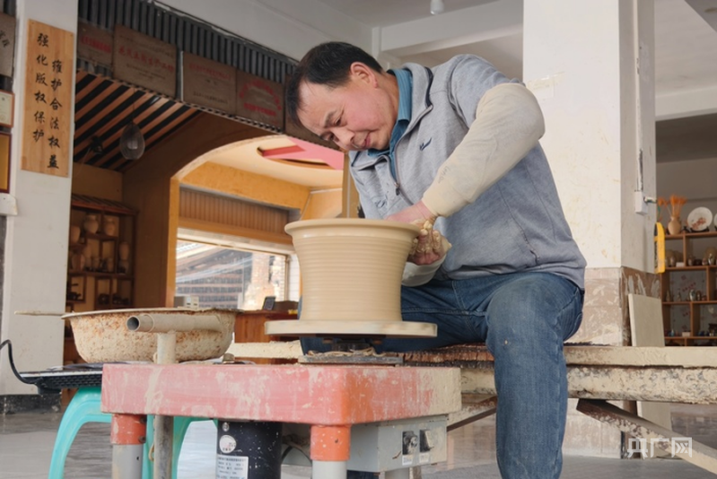 母先才在自己的陶藝館內制作盬子(央廣網記者 欒小琳 攝)