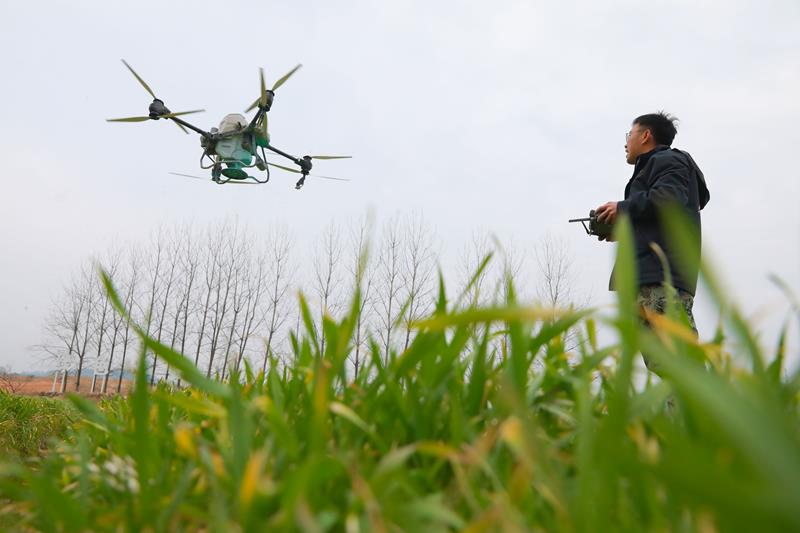 2025年2月14日,在浙江杭州市臨安區(qū)天目山鎮(zhèn)“天目糧倉(cāng)”糧食功能區(qū),農(nóng)機(jī)人員遙控植保無人機(jī)給小麥?zhǔn)┓省?/p>