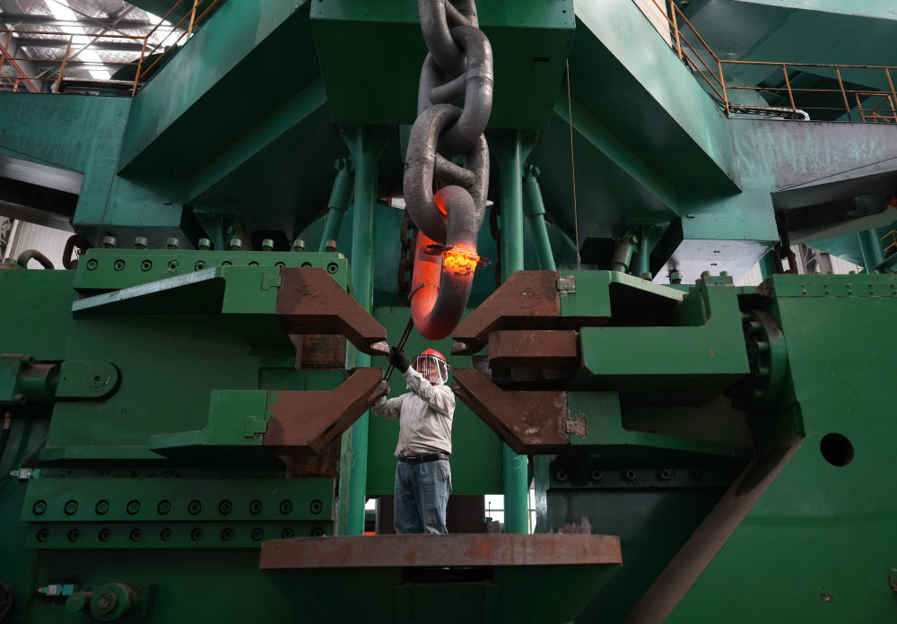 2024年6月4日,江蘇泰州靖江市江蘇亞星錨鏈股份有限公司工人在生產(chǎn)車間作業(yè)。該公司前身是40多年前創(chuàng)辦于靖江東興鎮(zhèn)的一個小廠,經(jīng)過多年發(fā)展,逐漸成長為國家級制造業(yè)單項冠軍示范企業(yè)。目前該公司船用鏈條全國市占率達70%,全球市占率超50%,業(yè)務(wù)已拓展到海洋鉆井平臺、海洋生產(chǎn)平臺、海上風(fēng)電設(shè)施的系泊錨鏈等領(lǐng)域。