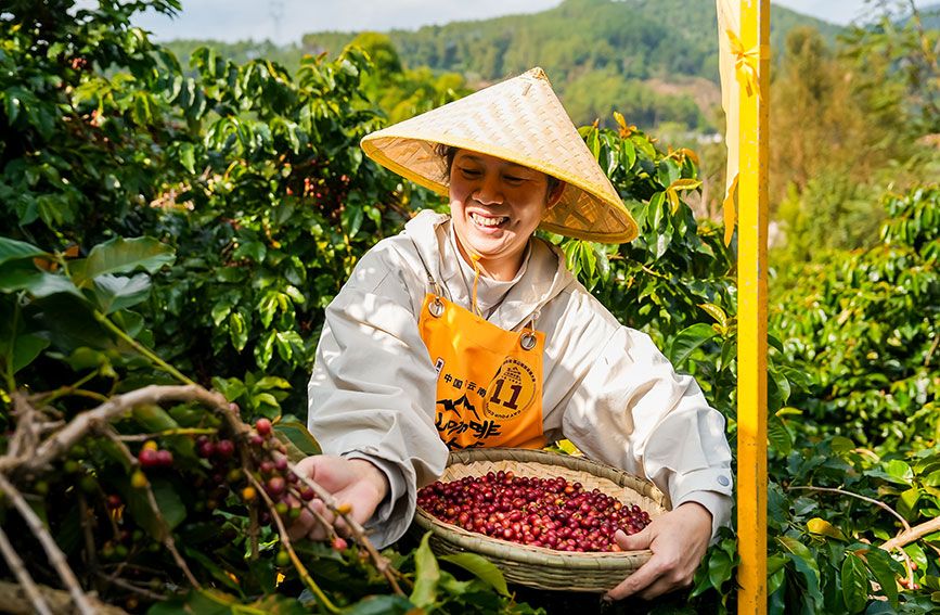 咖農正在采摘咖啡。人民網記者虎遵會攝