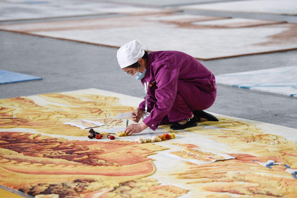 青海湖畔翱翔的水鳥、雪山下起舞的藏族女孩……在圣源地毯集團有限公司車間內,手持電織槍的女工們,正按照設計圖織出精美立體的圖案。