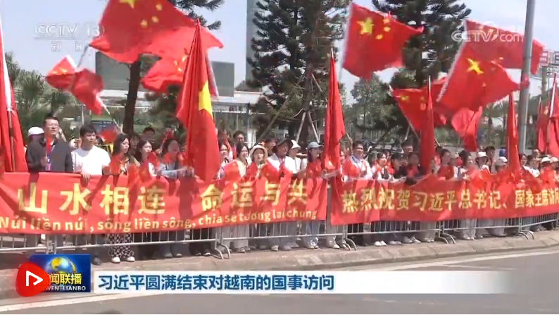 離開河內(nèi)時,越南總理范明政,越共中央政治局委員、中央書記處常務書記陳錦繡,越共中央書記處書記、中央辦公廳主任黎懷忠等越南黨政領導人和地方代表到機場送行。當?shù)孛癖姾椭匈Y機構(gòu)、留學生代表高舉紅色橫幅,熱烈祝賀習近平訪問越南取得圓滿成功。