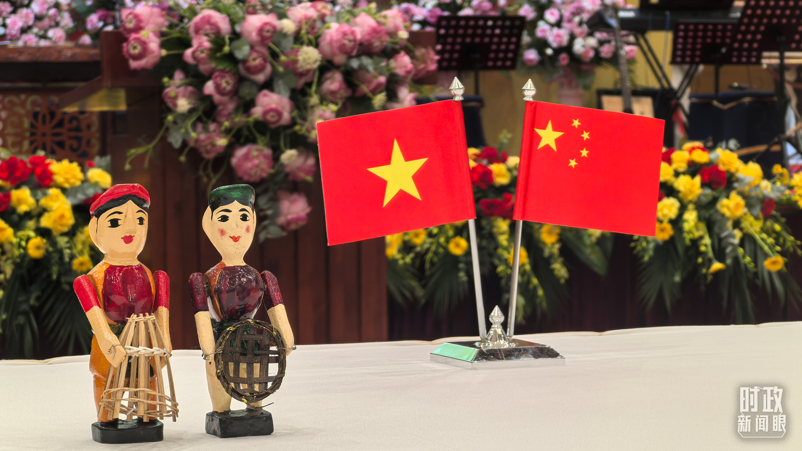 歡迎宴會現場擺放的中越兩國國旗。(總臺央視記者鄂介甫拍攝)