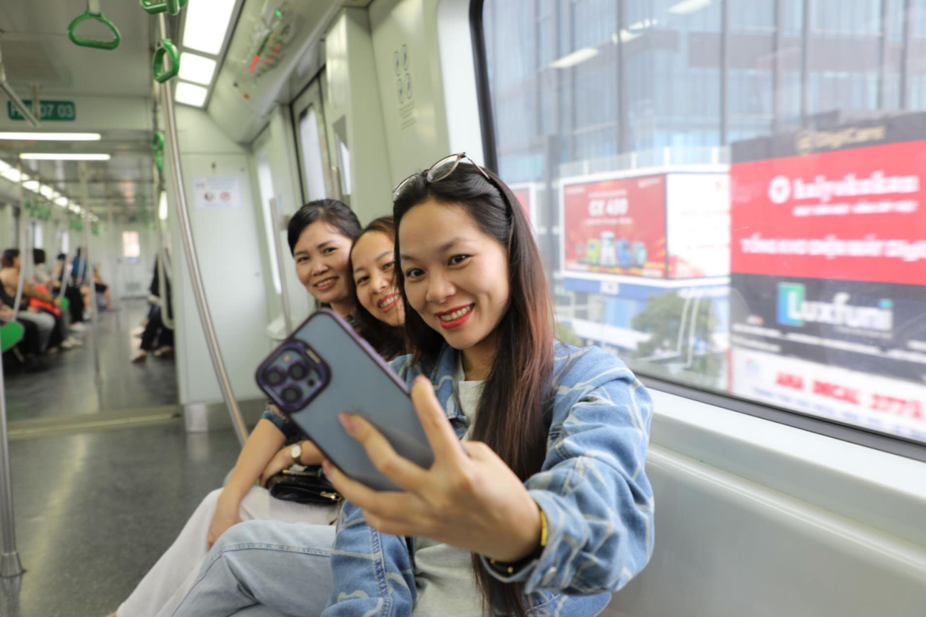 越南當(dāng)?shù)孛癖娫诤觾?nèi)吉靈-河?xùn)|線輕軌車廂里自拍。(人民日?qǐng)?bào)記者 沈小曉 攝)