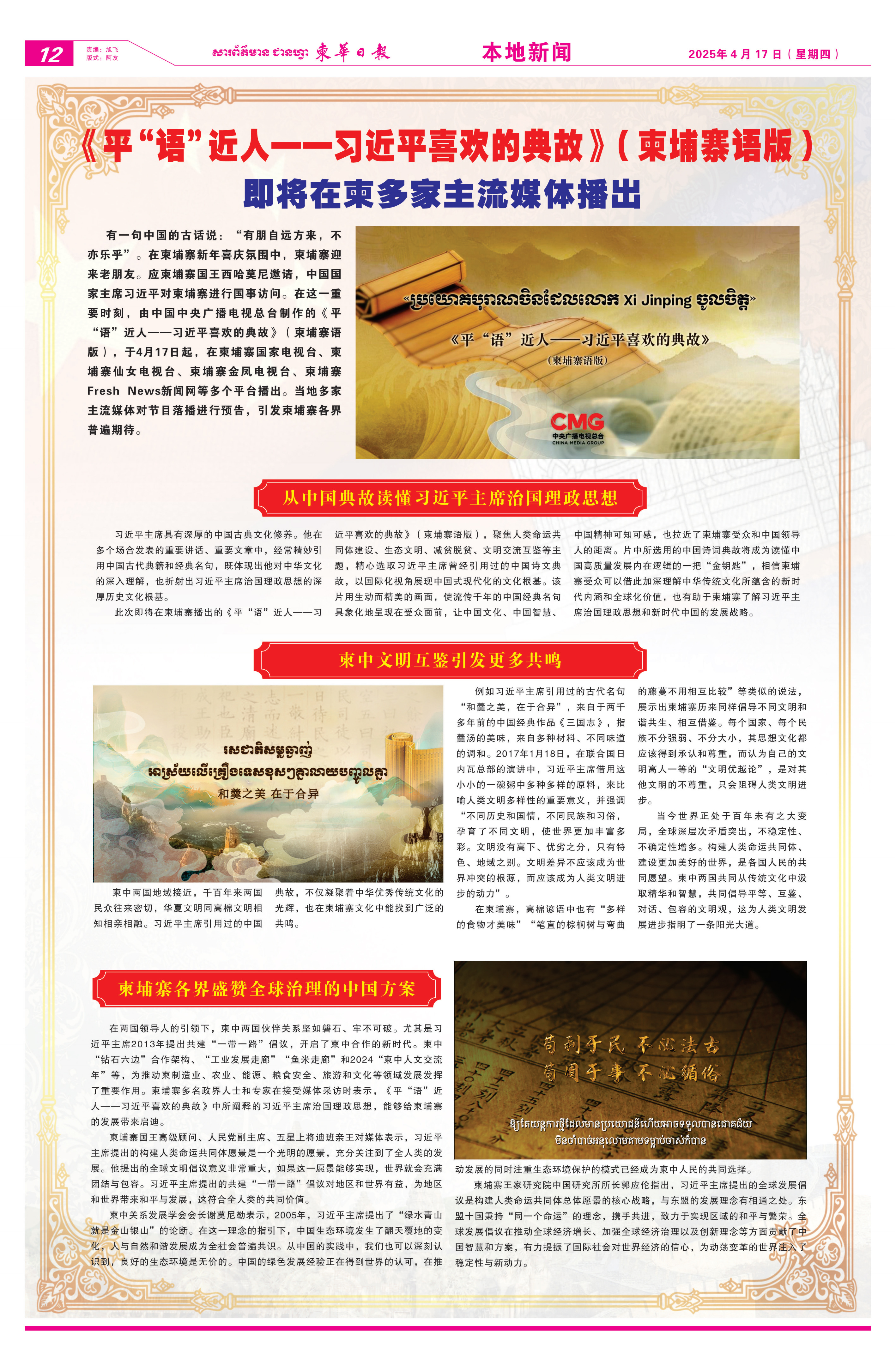 4月12日至17日,《柬華日?qǐng)?bào)》《大都市報(bào)》等當(dāng)?shù)貓?bào)紙刊發(fā)節(jié)目播出預(yù)告消息。文章指出,《平“語(yǔ)”近人——習(xí)近平喜歡的典故》(柬埔寨語(yǔ)版)是一把讀懂中國(guó)高質(zhì)量發(fā)展內(nèi)在邏輯的“金鑰匙”,相信柬埔寨受眾可以通過(guò)這些中國(guó)古籍和經(jīng)典名句加深理解中華優(yōu)秀傳統(tǒng)文化所蘊(yùn)含的新時(shí)代內(nèi)涵和全球化價(jià)值,了解習(xí)近平主席治國(guó)理政思想和新時(shí)代中國(guó)的發(fā)展戰(zhàn)略。