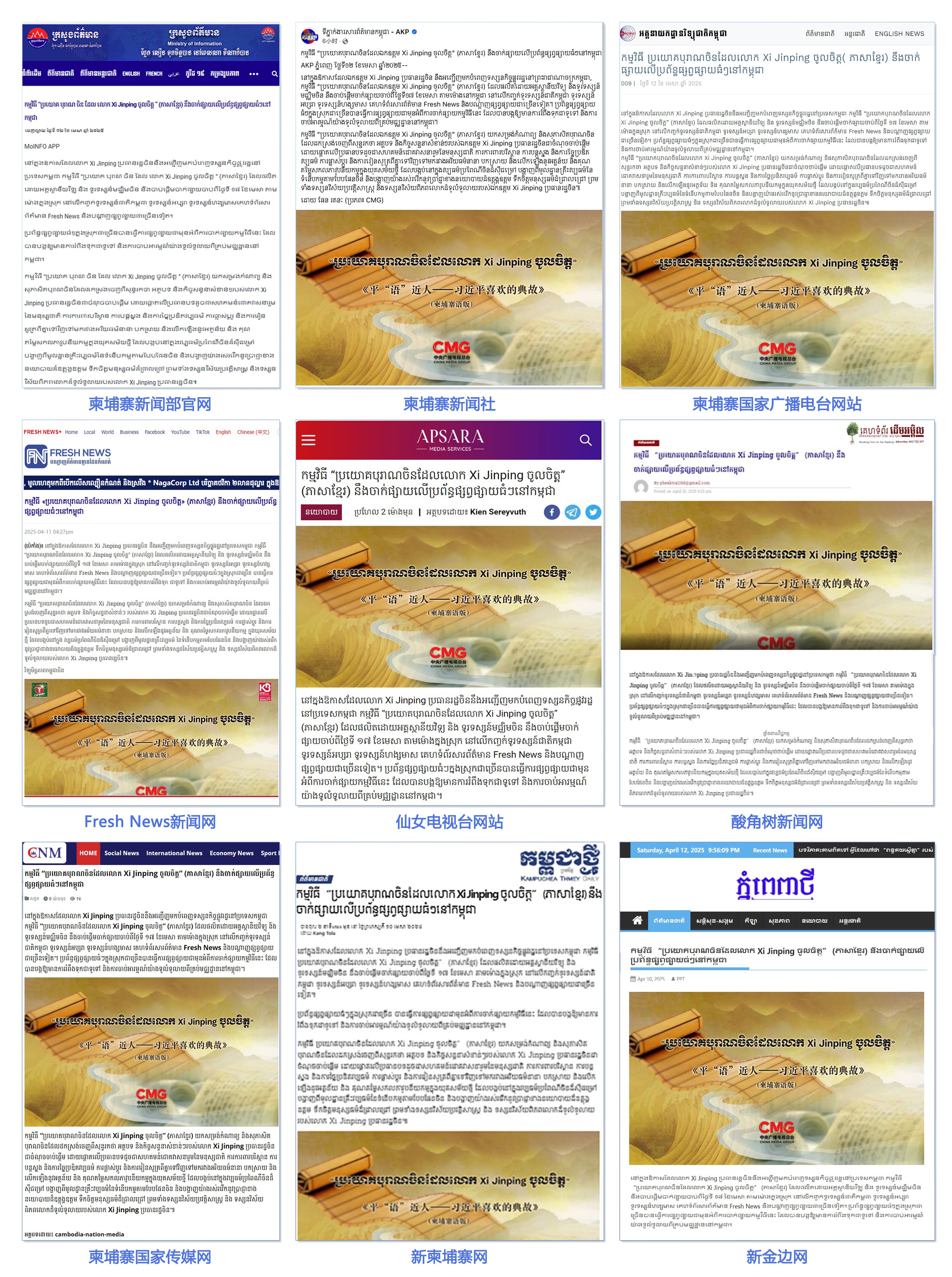 柬埔寨新聞部官網(wǎng)、柬埔寨新聞社、柬埔寨國(guó)家廣播電臺(tái)網(wǎng)站、Fresh News新聞網(wǎng)、仙女電視臺(tái)網(wǎng)站、柬中記協(xié)網(wǎng)站、酸角樹(shù)新聞網(wǎng)、柬埔寨國(guó)家傳媒網(wǎng)、新柬埔寨網(wǎng)、新金邊網(wǎng)、《金邊日?qǐng)?bào)》網(wǎng)等柬主流媒體發(fā)布相關(guān)報(bào)道。