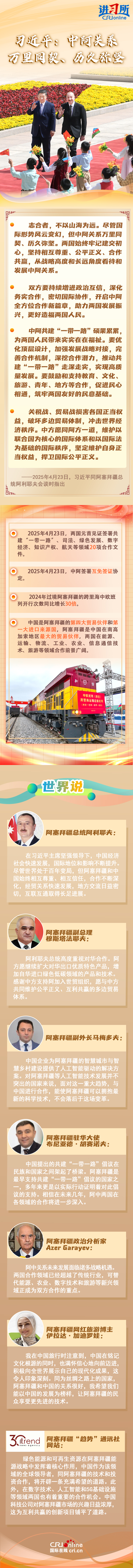 4月23日,中國國家主席習近平在北京同阿塞拜疆總統(tǒng)阿利耶夫舉行會談。兩國元首宣布,建立中阿全面戰(zhàn)略伙伴關(guān)系。習近平指出,盡管國際形勢風云變幻,但中阿關(guān)系萬里同契、歷久彌堅。雙方要持續(xù)增進政治互信,深化務實合作,密切國際協(xié)作,開啟中阿全方位合作新篇章,助力兩國發(fā)展振興,更好造福兩國人民。