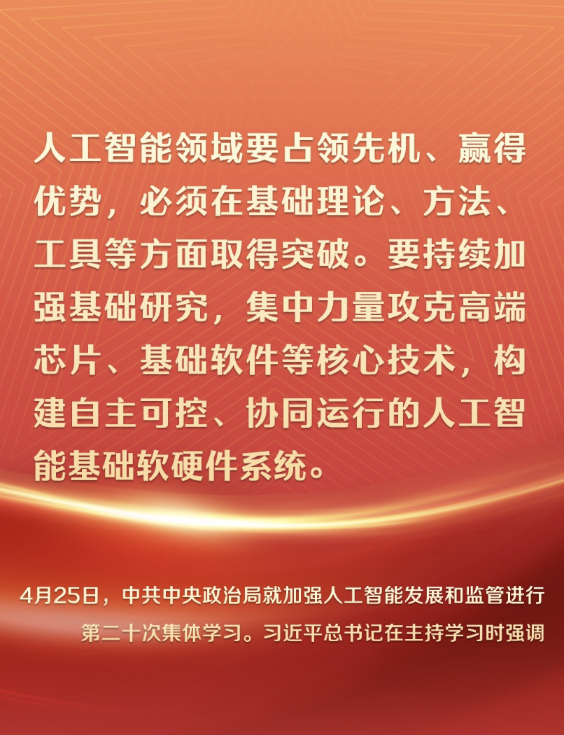 就在4天前,4月25日下午,中共中央政治局就加強人工智能發(fā)展和監(jiān)管進行第二十次集體學習。習近平總書記在主持學習時強調(diào):