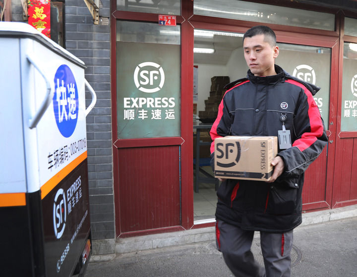 北京前門石頭胡同快遞站點“快遞小哥”劉闊在整理包裹(2019年2月1日攝)。新華社記者 李德欣 攝