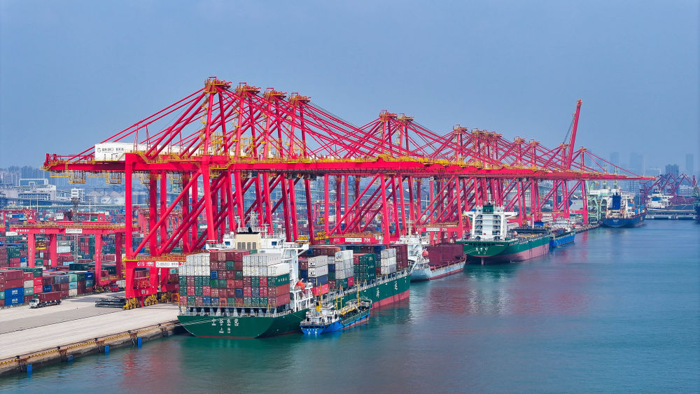 輪船在山東港口日照港集裝箱碼頭停泊作業(yè)(無人機照片,2024年8月22日攝)。新華社記者 李紫恒 攝