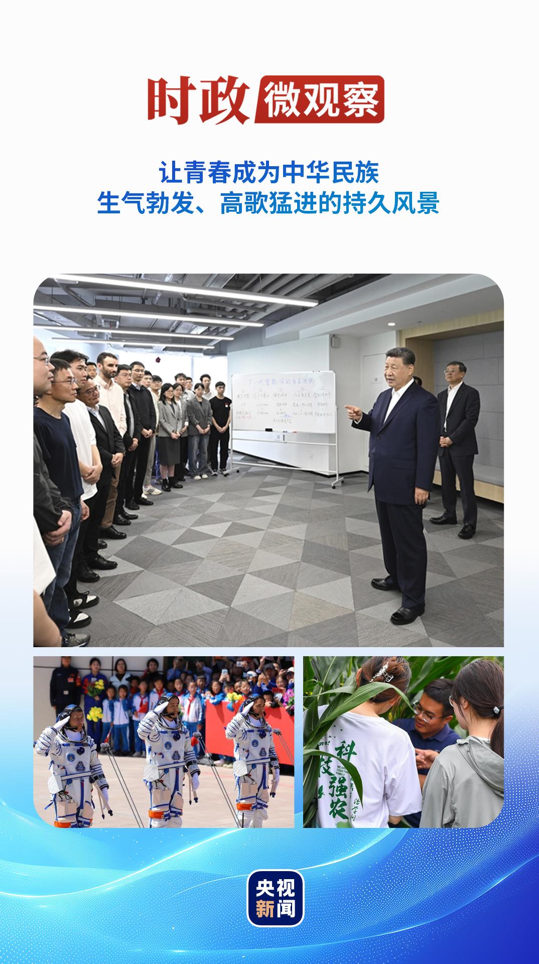 今年五四青年節(jié)前,習(xí)近平總書記再次來到年輕人中間。4月29日,在上?!澳K倏臻g”大模型創(chuàng)新生態(tài)社區(qū),總書記同青年創(chuàng)新人才親切交流,勉勵(lì)大家“把個(gè)人奮斗同國(guó)家前途命運(yùn)緊緊聯(lián)系在一起,跑好歷史的接力棒,在推進(jìn)中國(guó)式現(xiàn)代化的寬廣舞臺(tái)上綻放絢麗的青春光彩”。