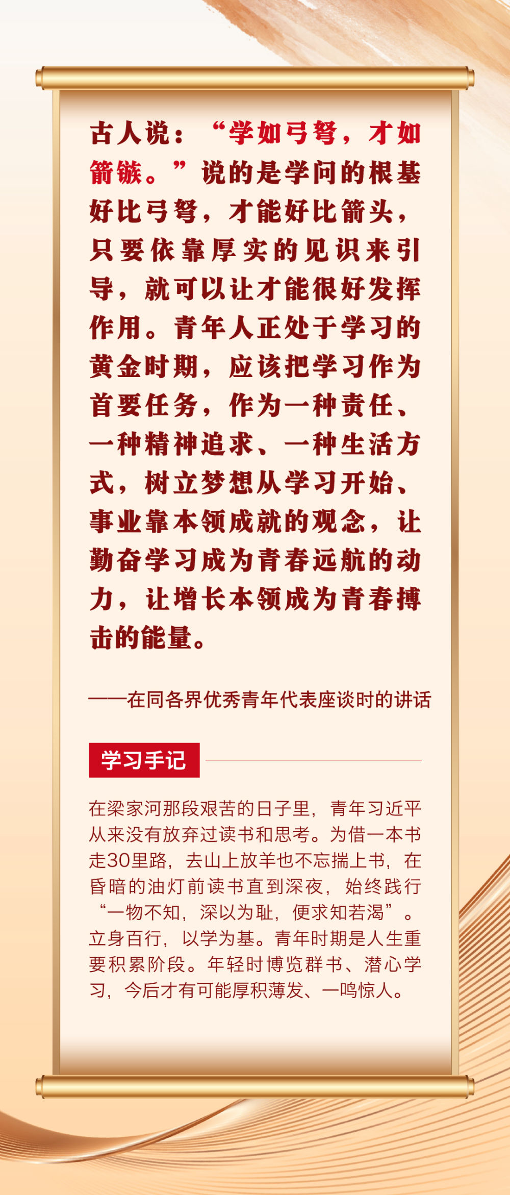 “青年者,國家之魂?!鼻嗄暌淮院畏N精神風(fēng)貌站上時代舞臺,關(guān)乎祖國的明天、民族的未來。黨的十八大以來,習(xí)近平總書記圍繞青年成長成才作出許多重要論述。其中,有信手拈來的精妙典故,有貫古通今的廣征博引,引領(lǐng)廣大青年不斷在中華文化的浸潤中堅定中國心、涵養(yǎng)民族魂,成長為堪當(dāng)復(fù)興重任的時代新人。