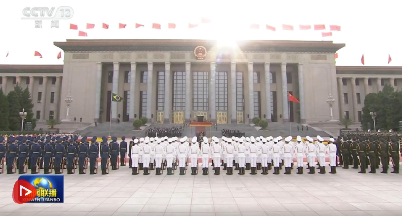 盧拉抵達時,禮兵列隊致敬。習近平同盧拉登上檢閱臺,軍樂團奏中巴兩國國歌,天安門廣場鳴放禮炮21響。盧拉在習近平陪同下檢閱中國人民解放軍儀仗隊,并觀看分列式。