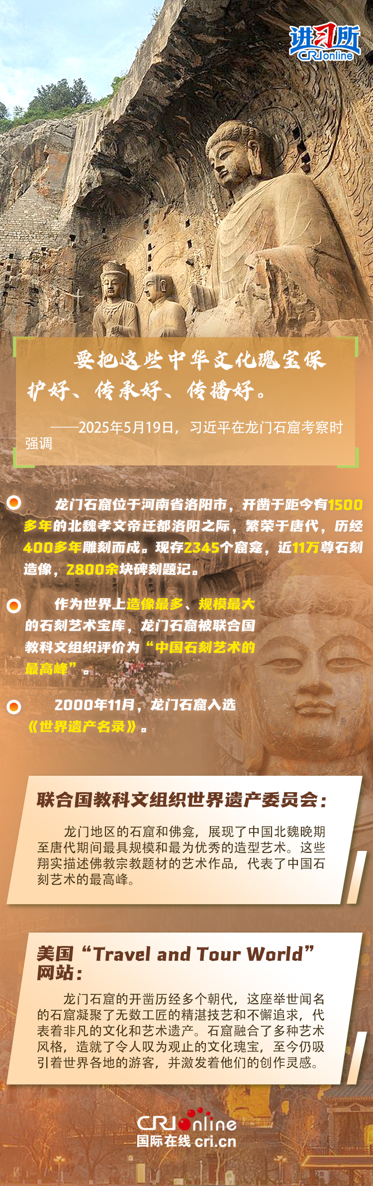 近日,中共中央總書記、國家主席習近平在河南洛陽考察調(diào)研。在龍門石窟,他察看石窟整體布局風貌和代表性窟龕、造像,叮囑現(xiàn)場的文物保護工作者要把這些中華文化瑰寶保護好、傳承好、傳播好。